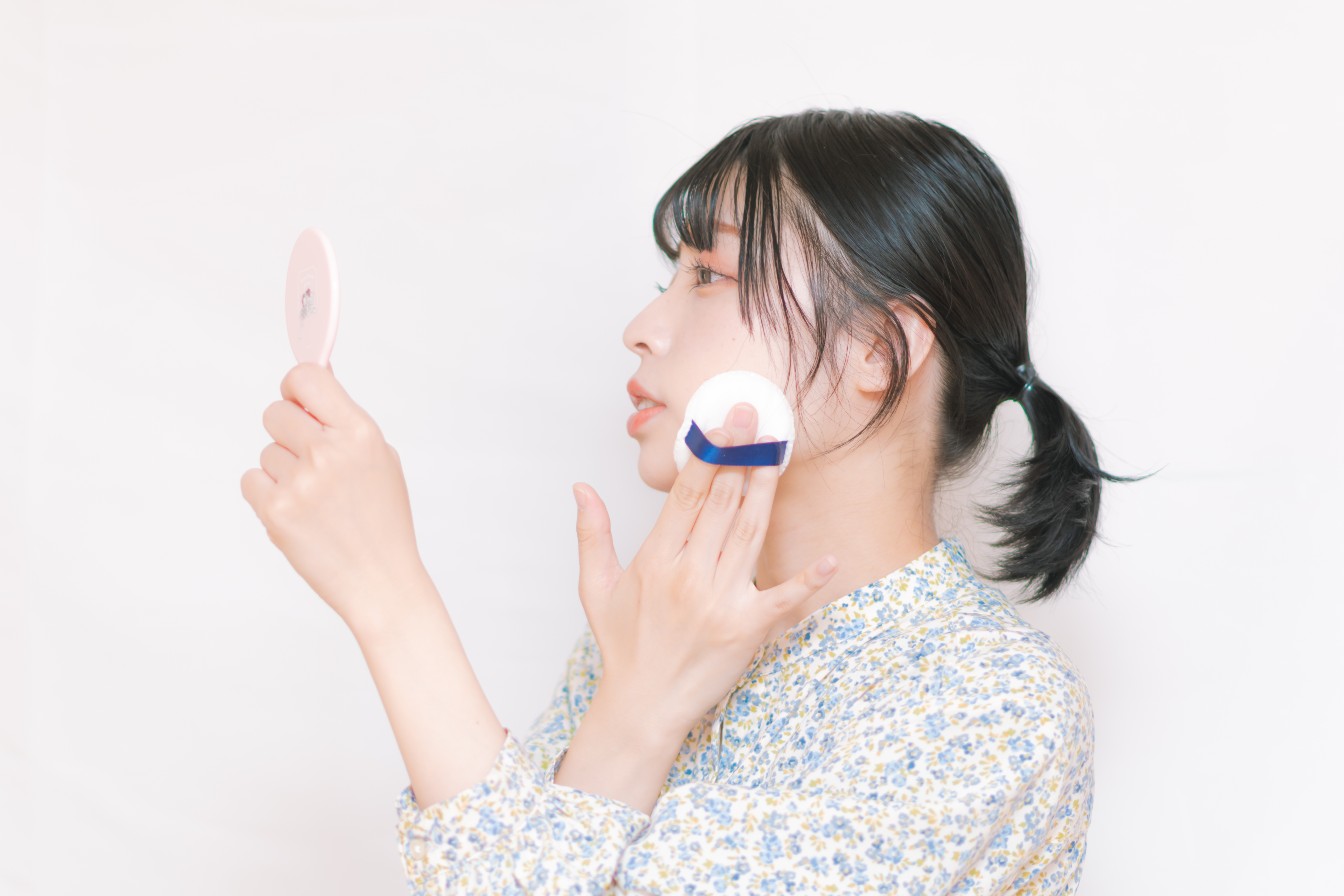パフを使ってメイクをする女性の横顔の写真素材です。小さな楕円形のピンク色のパフを手に持ち、頬に当てながらコンプレクション作りをしており、青と白の装飾が施された円形の鏡を覗き込んでいます。メイクやビューティー、化粧品関連のコンテンツ制作などにおすすめです。