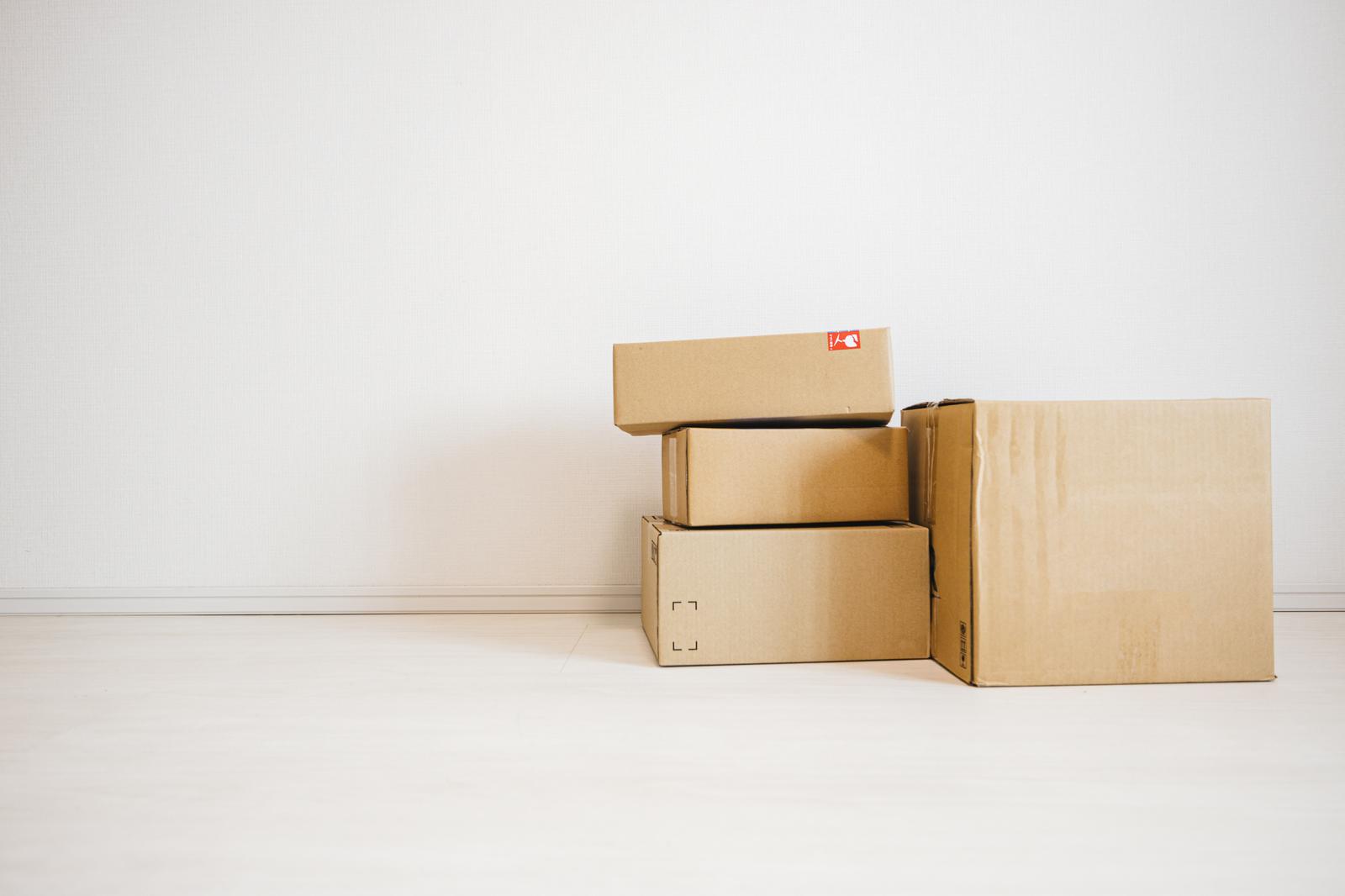 ネットショップから届いたダンボール箱の写真素材です。複数の段ボール箱が積み重ねられており、上部にある箱には赤いロゴシールが貼られ、側面には配送業者の記載が見えています。オンラインショッピングや配送サービス、eコマース関連のコンテンツなどにおすすめです。