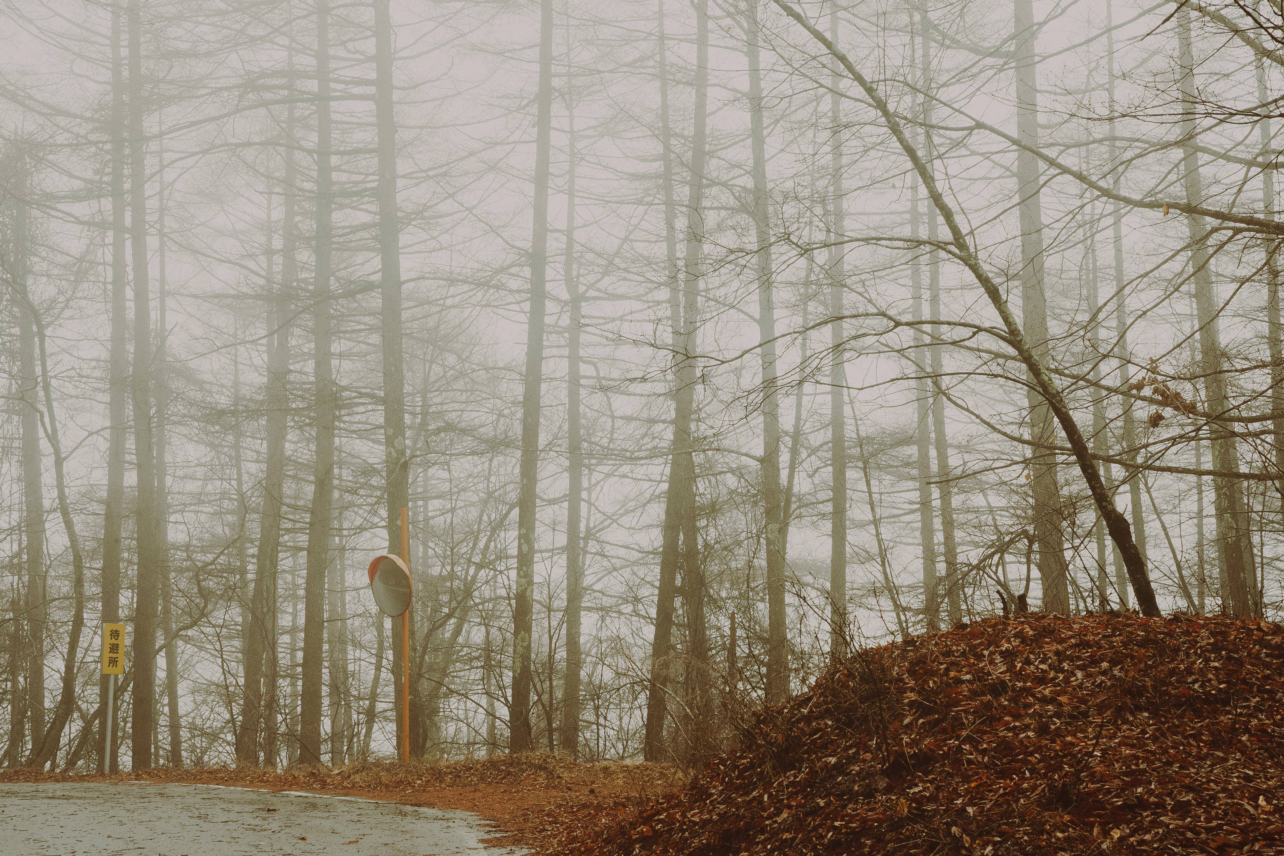 山道に立ち込める濃霧と落葉樹の雑木林の写真素材です。黄色い標識の立つ道路脇に広がる裸木の林が白い霧に包まれ、地面には褐色の落ち葉が積もり、冬の静寂が漂う情景となっています。天候や季節表現、冬景色のコンテンツなどにおすすめです。