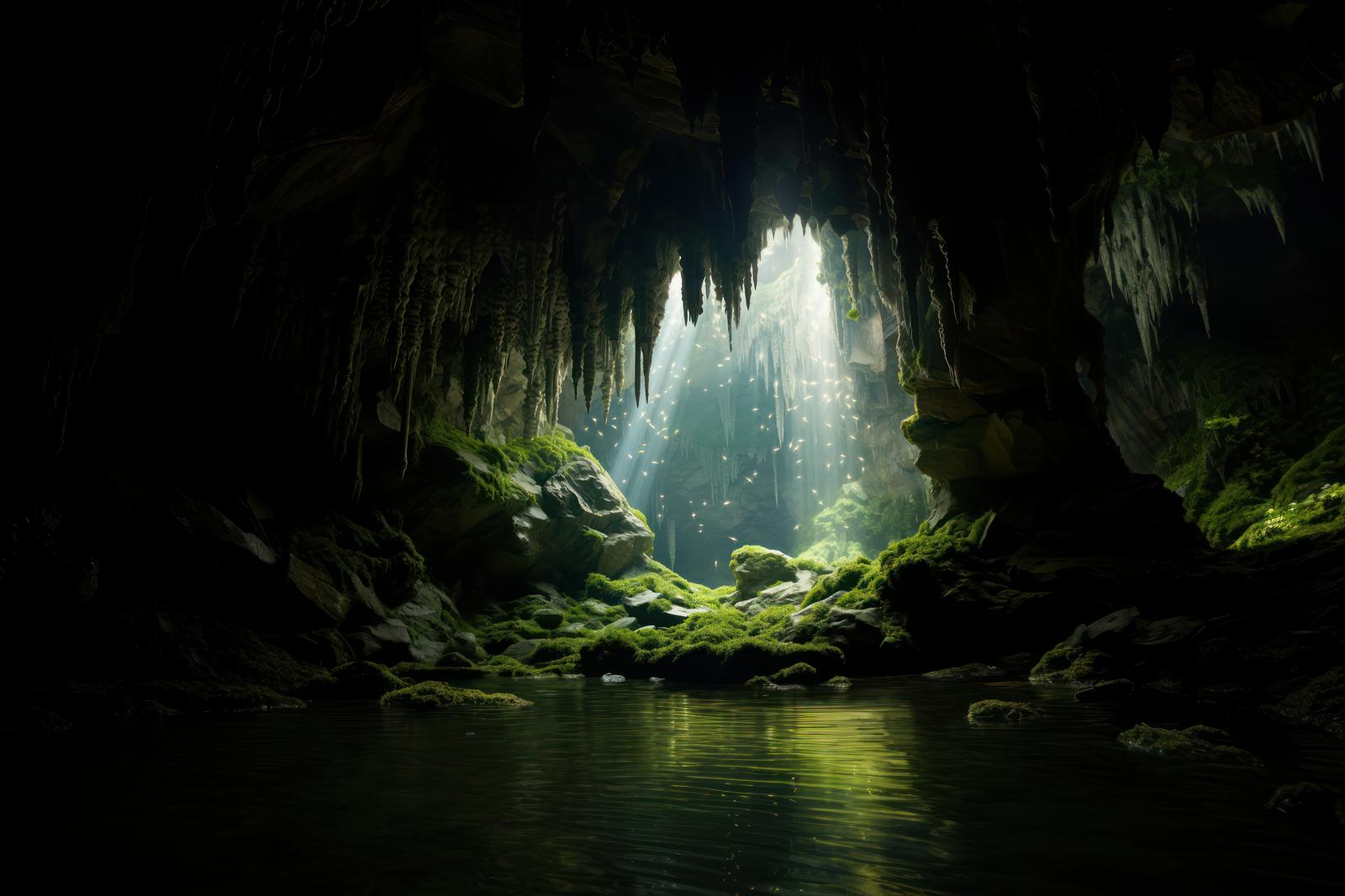 苔むした鍾乳洞から差し込む光芒と泉 - 神秘的な地下空間のAI画像素材(フリー)