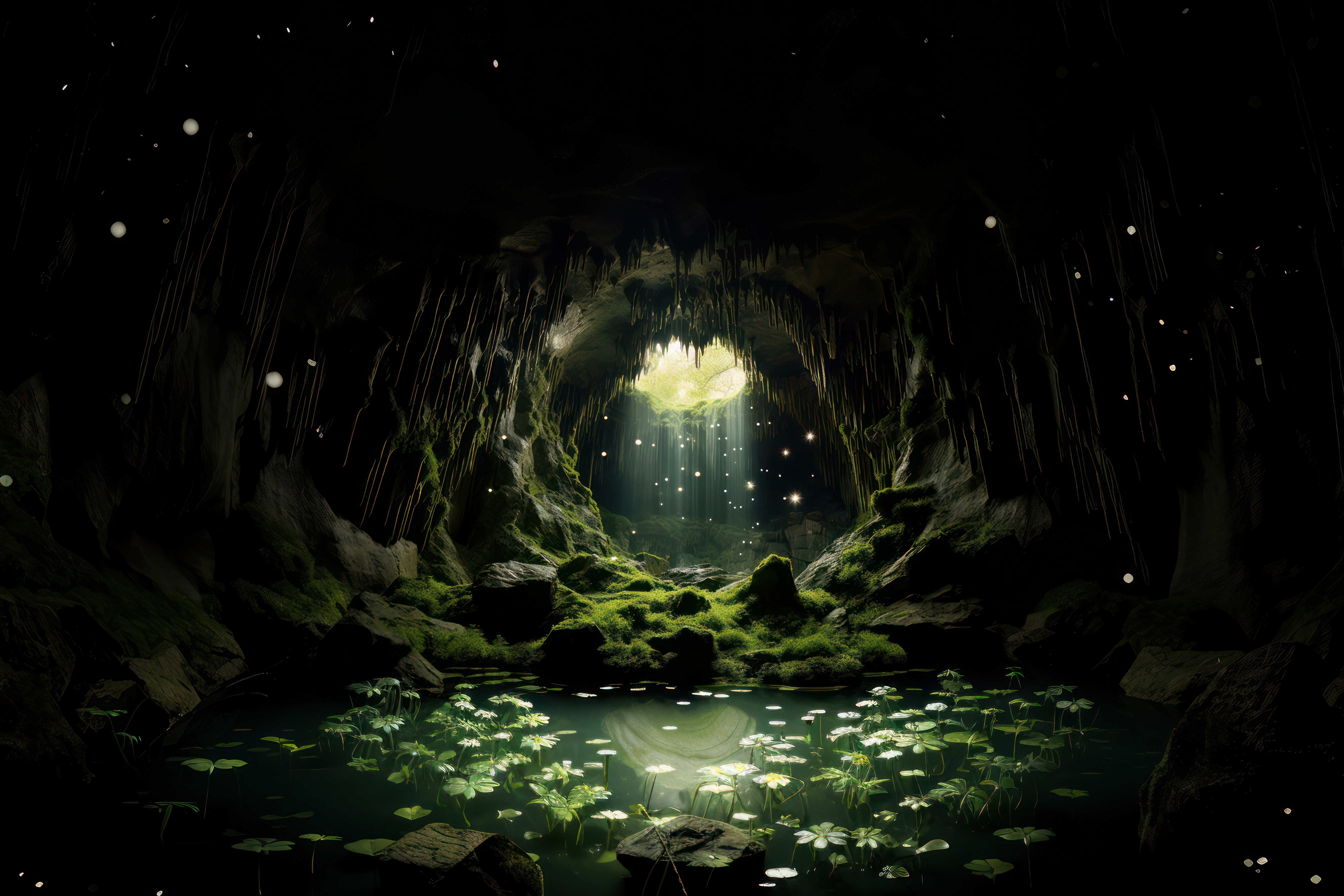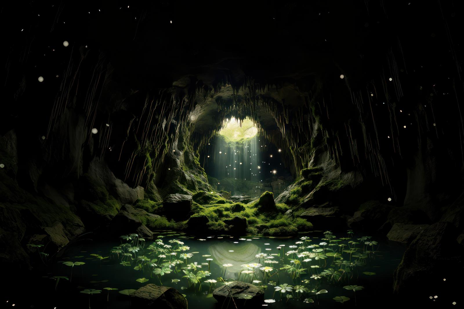 光差す泉の鍾乳洞 地下水に誕生する植物の息吹のAI画像素材(フリー)