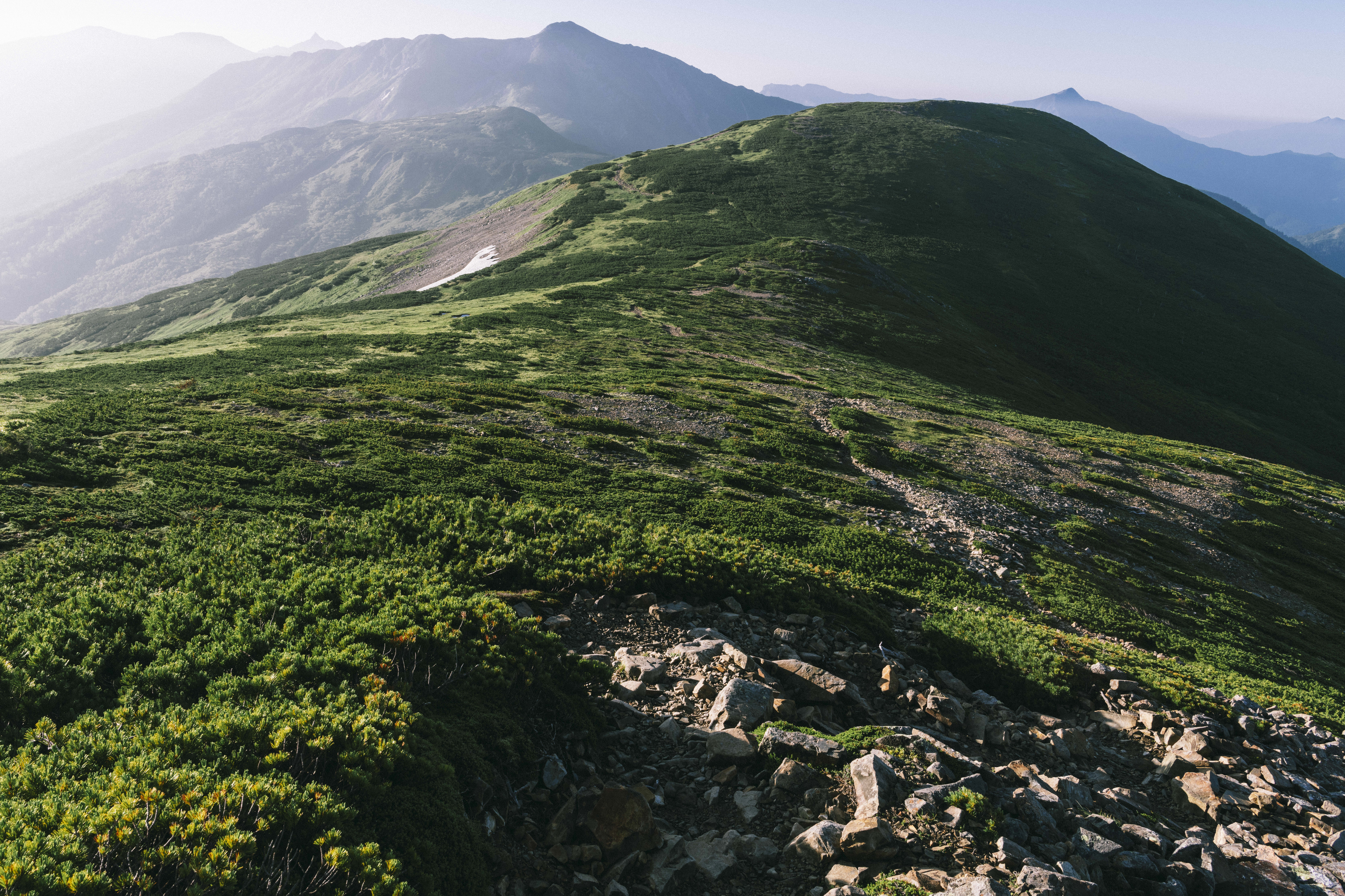 黒部五郎岳への登山道からの眺望を写した写真素材です。前景の低木や草地から黒部五郎岳の山容へと視線が奥へ向かい、日本百名山に選ばれた黒部五郎岳を含む複数の峰々が連なる稜線まで壮大に広がっています。登山ブログやトレッキング関連サイト、山岳風景のコンテンツ制作などにおすすめです。
