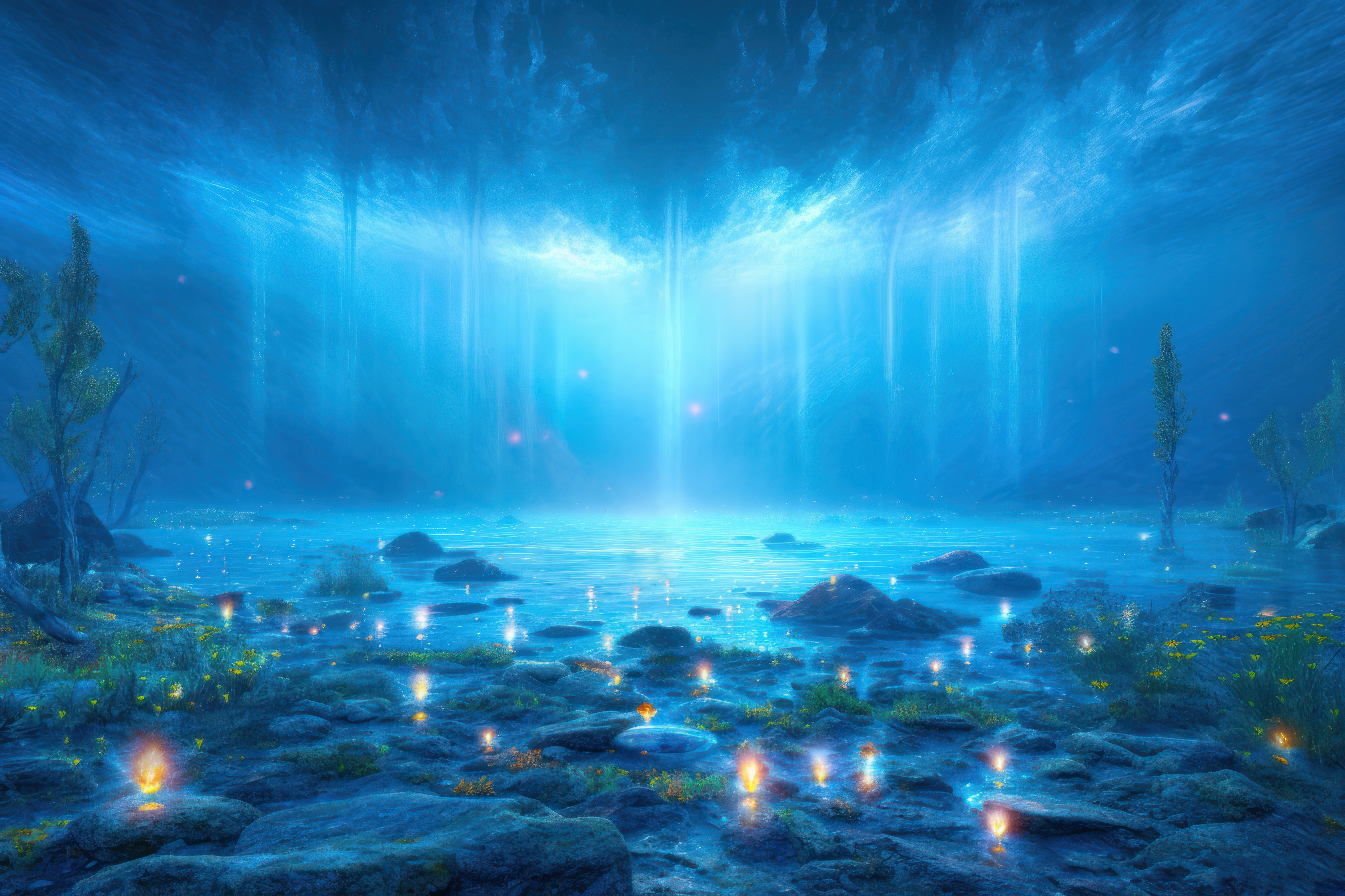 青い水面に灯火が浮かぶ神聖な泉の異世界風景