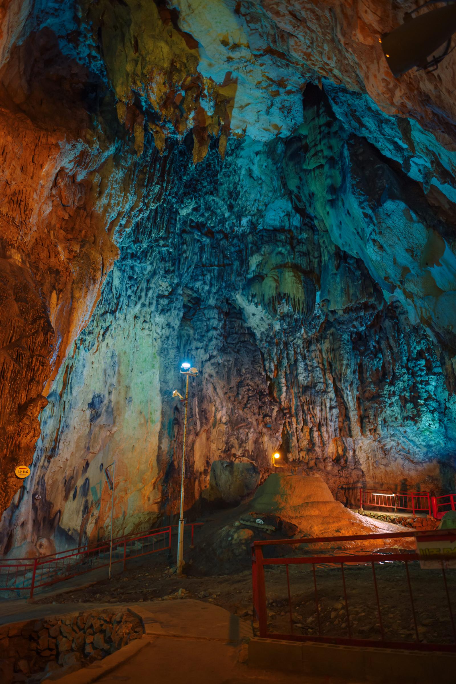 岡山県の備中鐘乳穴の内部を撮影した写真素材です。洞窟の天井から壁に至るまで発達した鍾乳石が覆い、青と黄色いライトで照らされることでオレンジ色の岩肌と緑がかった鍾乳石部分が明暗で浮かび上がり、赤い柵と街灯が見えるウォーキング通路が奥に続いています。観光地紹介や地質学関連、旅行ガイドなどにおすすめです。