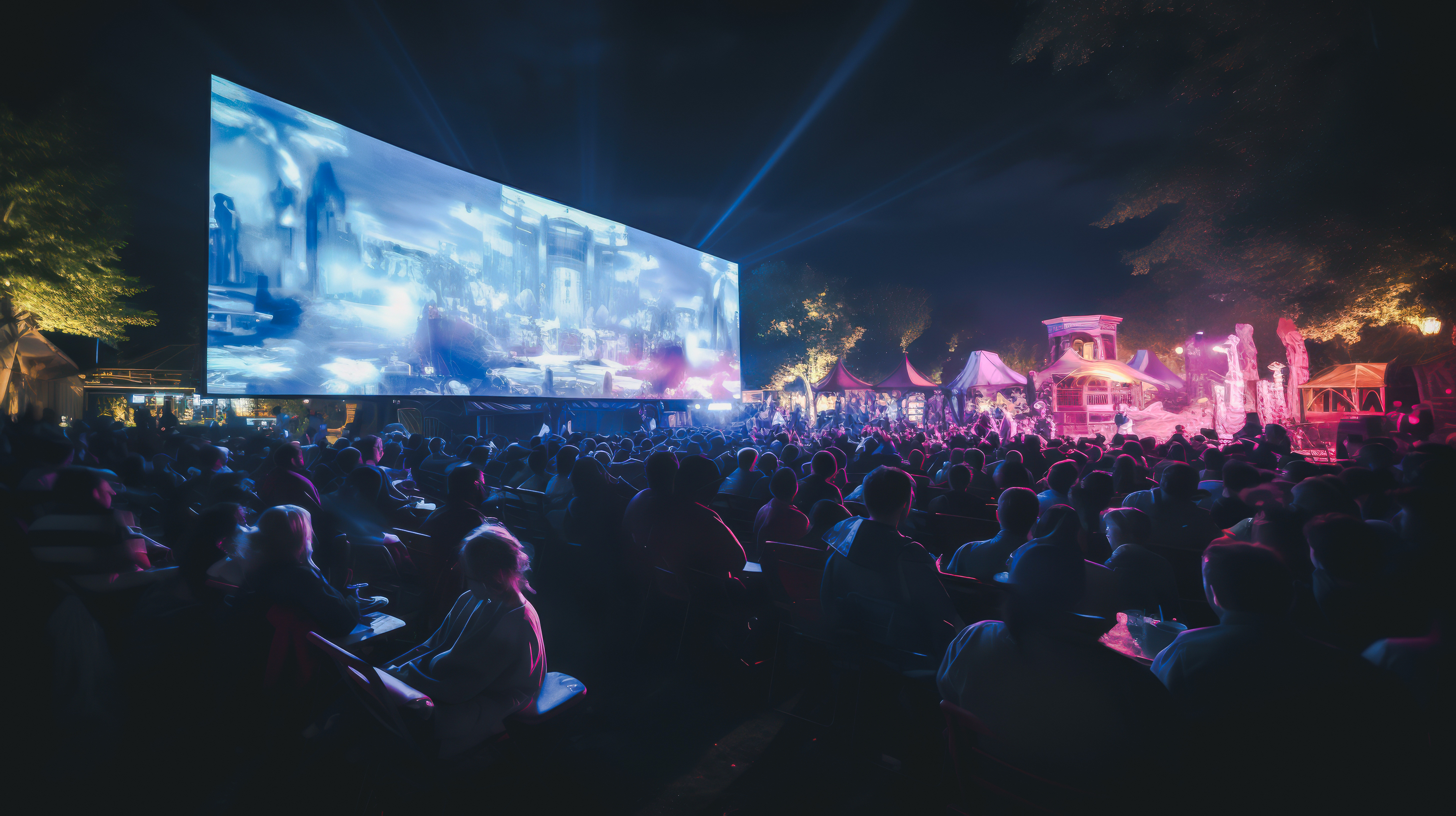 AIで生成した夜間のパブリックビューイング会場の画像素材です。大型スクリーンを観客が見守り、ピンク色と黄色のライティングで照らされたステージ、樹木のスポットライト照明が設営されています。eスポーツ大会やライブイベント、野外映画上映などの告知やプロモーション素材として活用できます。