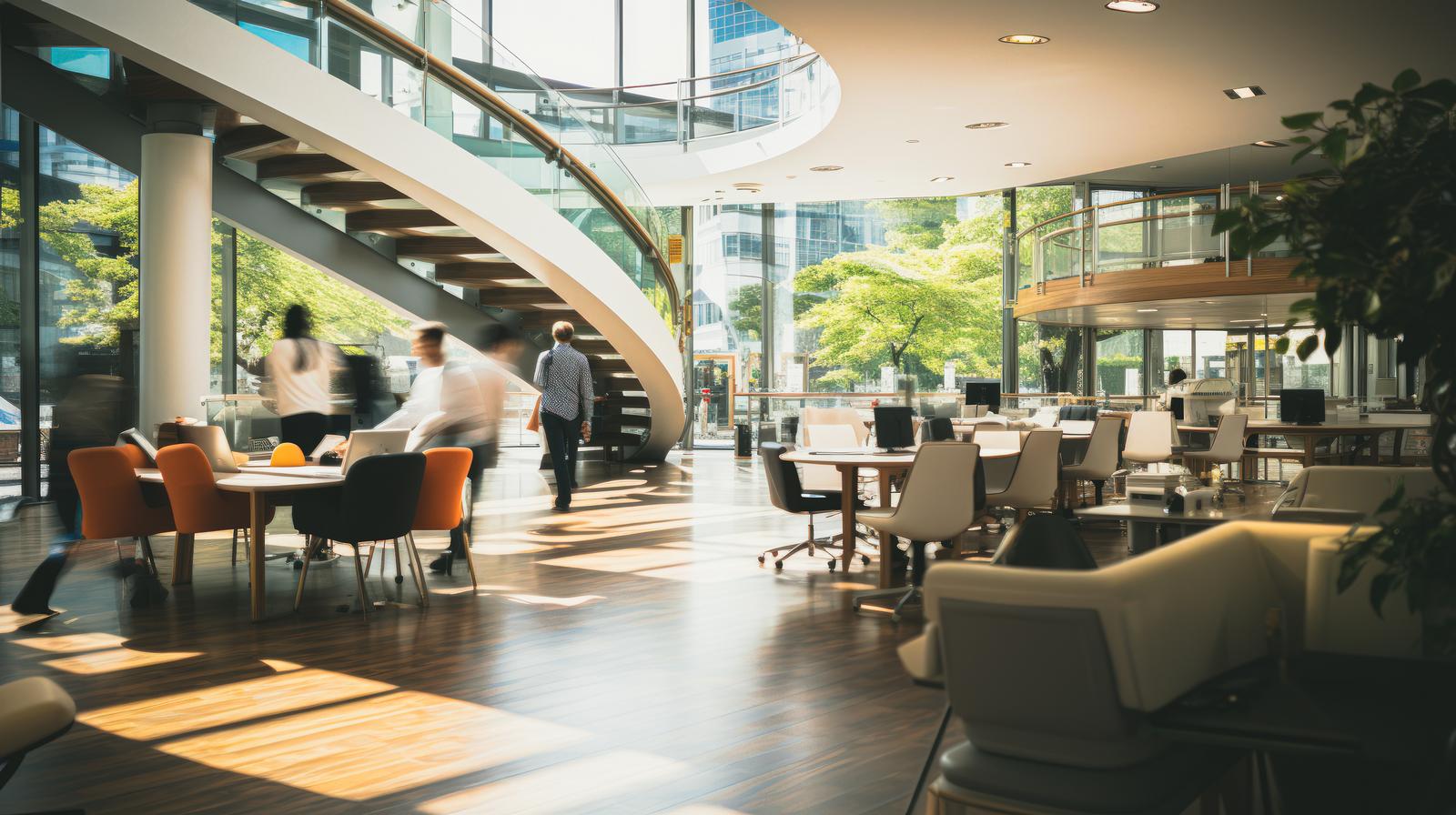広々としたコワーキングスペースのロビーと複数のワークエリアのAI画像素材(フリー)