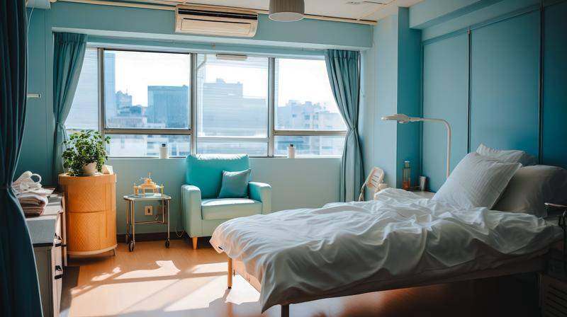 ターコイズブルーの壁のビジネスホテル客室。ベッドの先に高層ビル群が見える窓がある