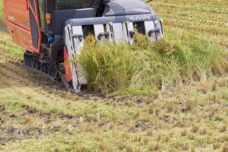 コンバインで稲を刈り取る収穫作業の写真素材です。赤と紺色のコンバイン機械が田んぼを進み、前部のヘッダー部分で稲を刈り込み、同時に脱穀しています。自動運転による効率的な農業機械化の様子が見て取れ、農業や農村風景、食料生産に関するコンテンツにおすすめです。