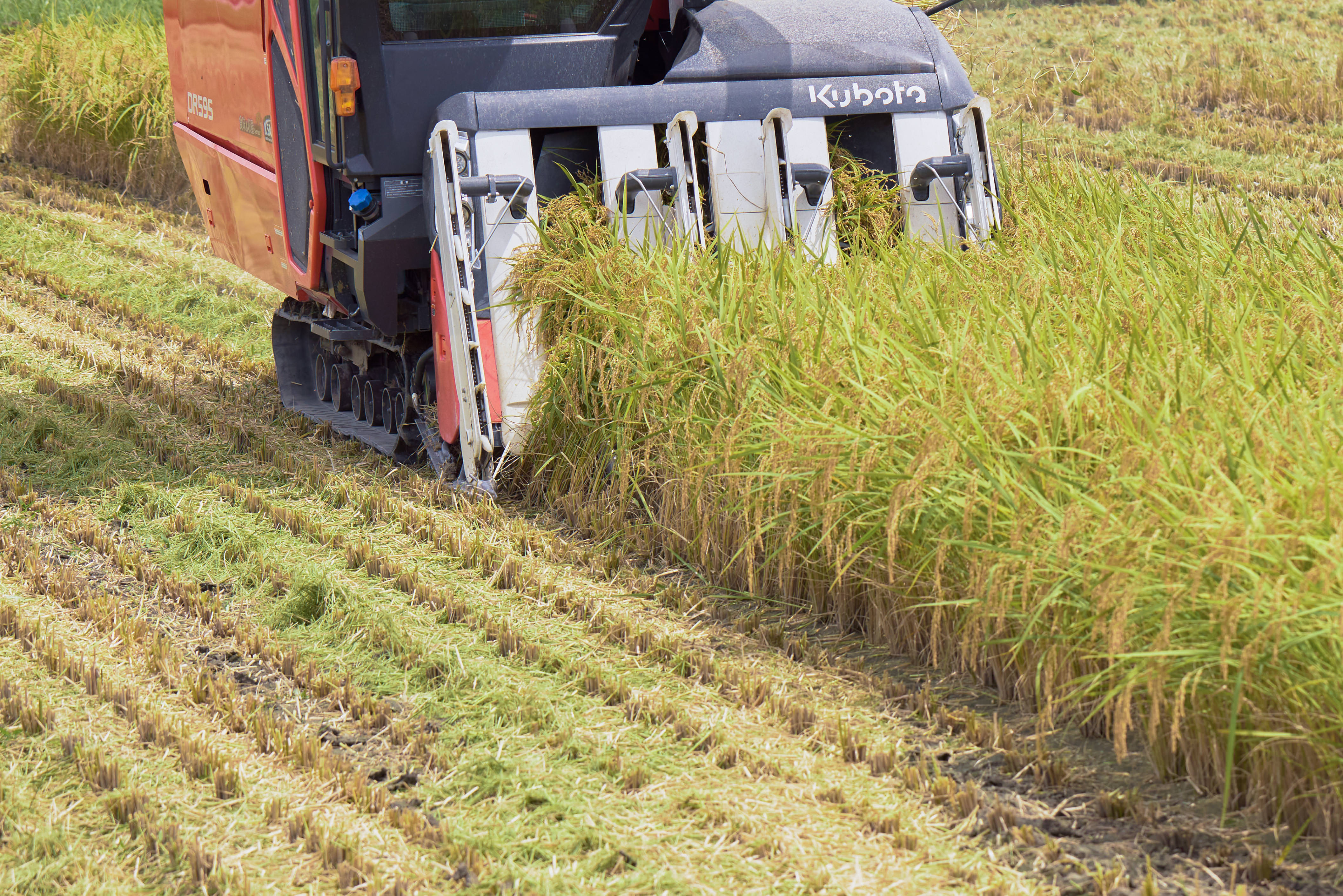 稲を刈るコンバインでの収穫作業の写真素材です。赤と黒のクボタのコンバイン機械が田んぼで稲を刈取り、白いシュートから刻みわらが落ちている様子を映した秋の農作業風景。農業や稲作、季節の農作業風景などのコンテンツに最適です。