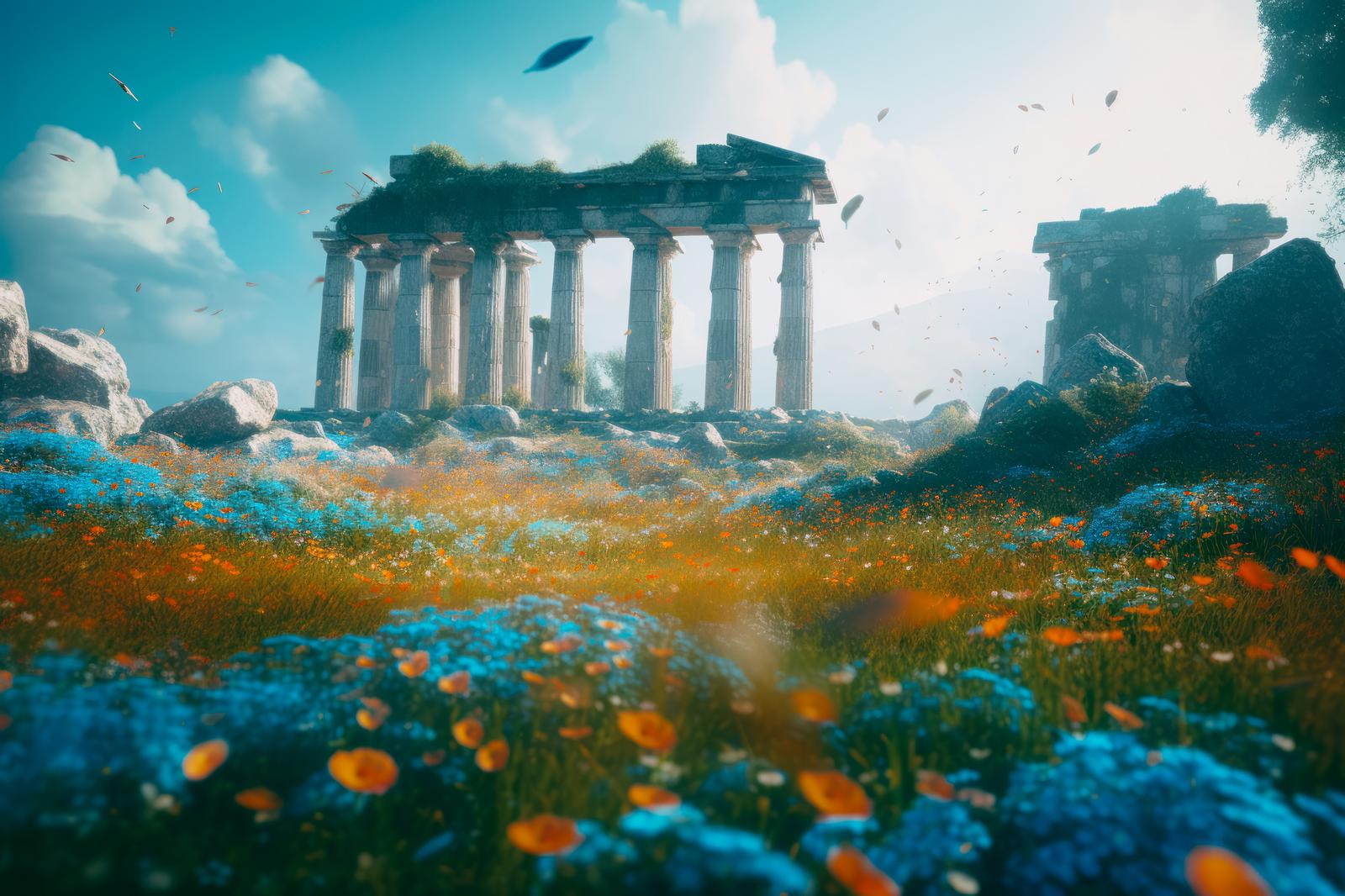 古代神殿遺跡を彩る青い草花、神話と高台から眺める遺産のAI画像素材(フリー)