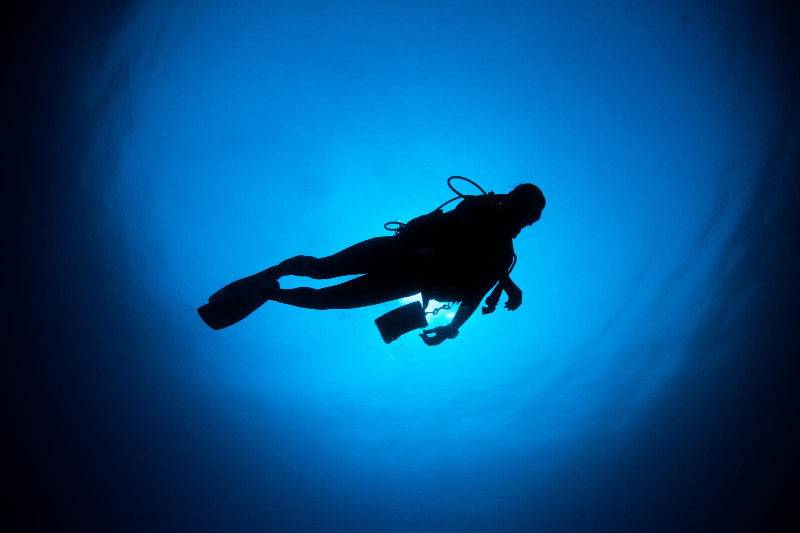 海中で泳ぐダイバーのシルエット、フィンとレギュレーター装備のフリー写真素材
