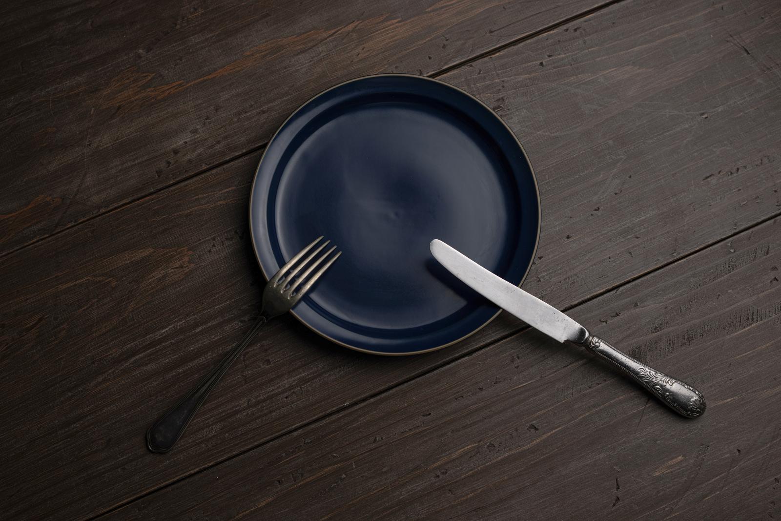 食事中に小休止を知らせるナイフとフォークの置き方の写真素材です。紺色の丸い皿の上に銀製のフォークとナイフが置かれており、フォークは皿の左側に、ナイフは右側に配置されて、アメリカ式テーブルマナーの休止のサインを表しています。テーブルマナーの解説やビジネスマナー関連のコンテンツ、食事作法の学習教材などに最適です。