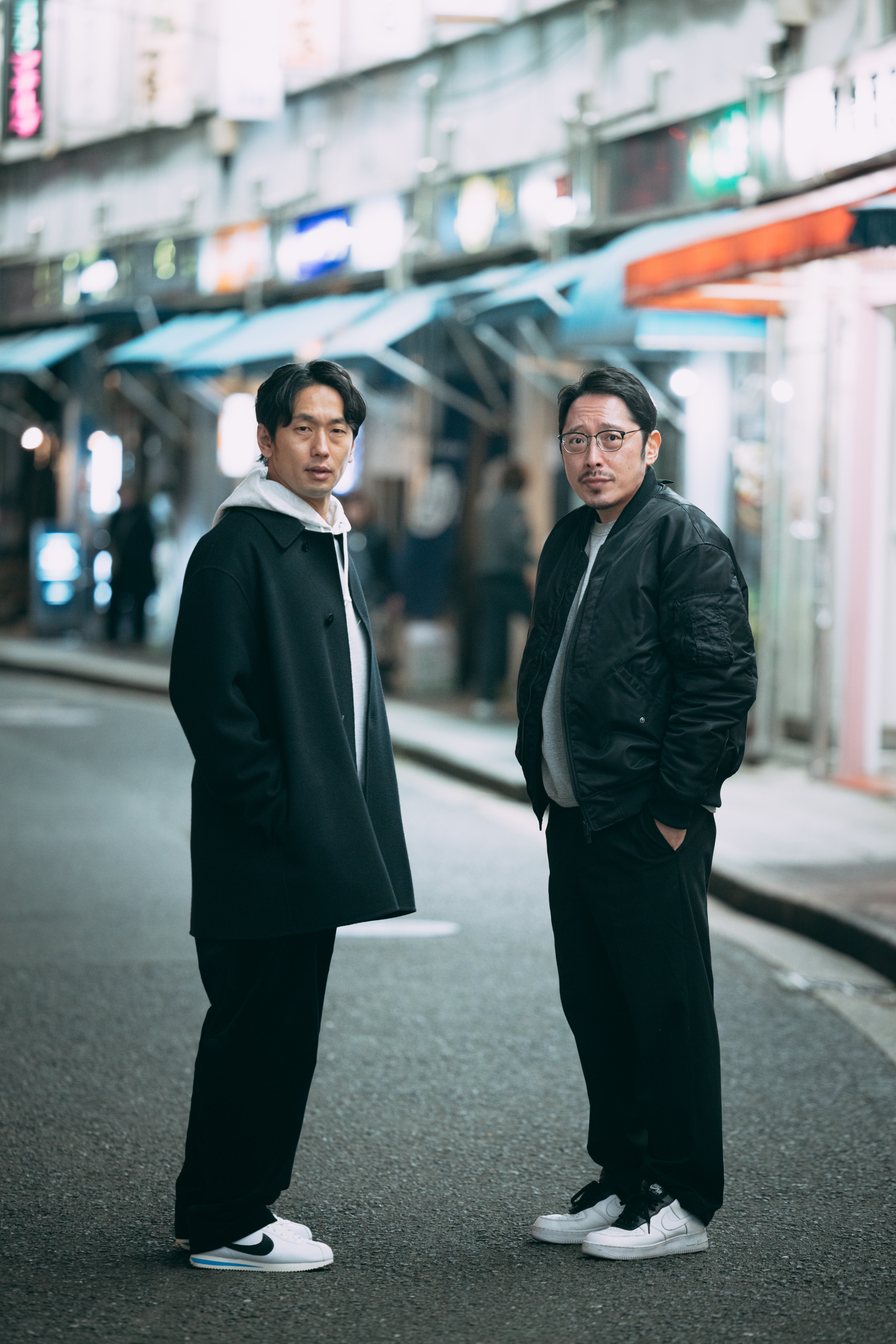 夜間の繁華街で立ち止まる男性二人のストリートスナップの写真素材です。黒いジャケットを着た男性二人が足を止め、カメラに視線を向けており、眼鏡をかけた男性は手をポケットに入れた姿勢で佇んでいます。探偵事務所の紹介や調査業務、ミステリー系コンテンツ、商業プロモーションなどにおすすめです。