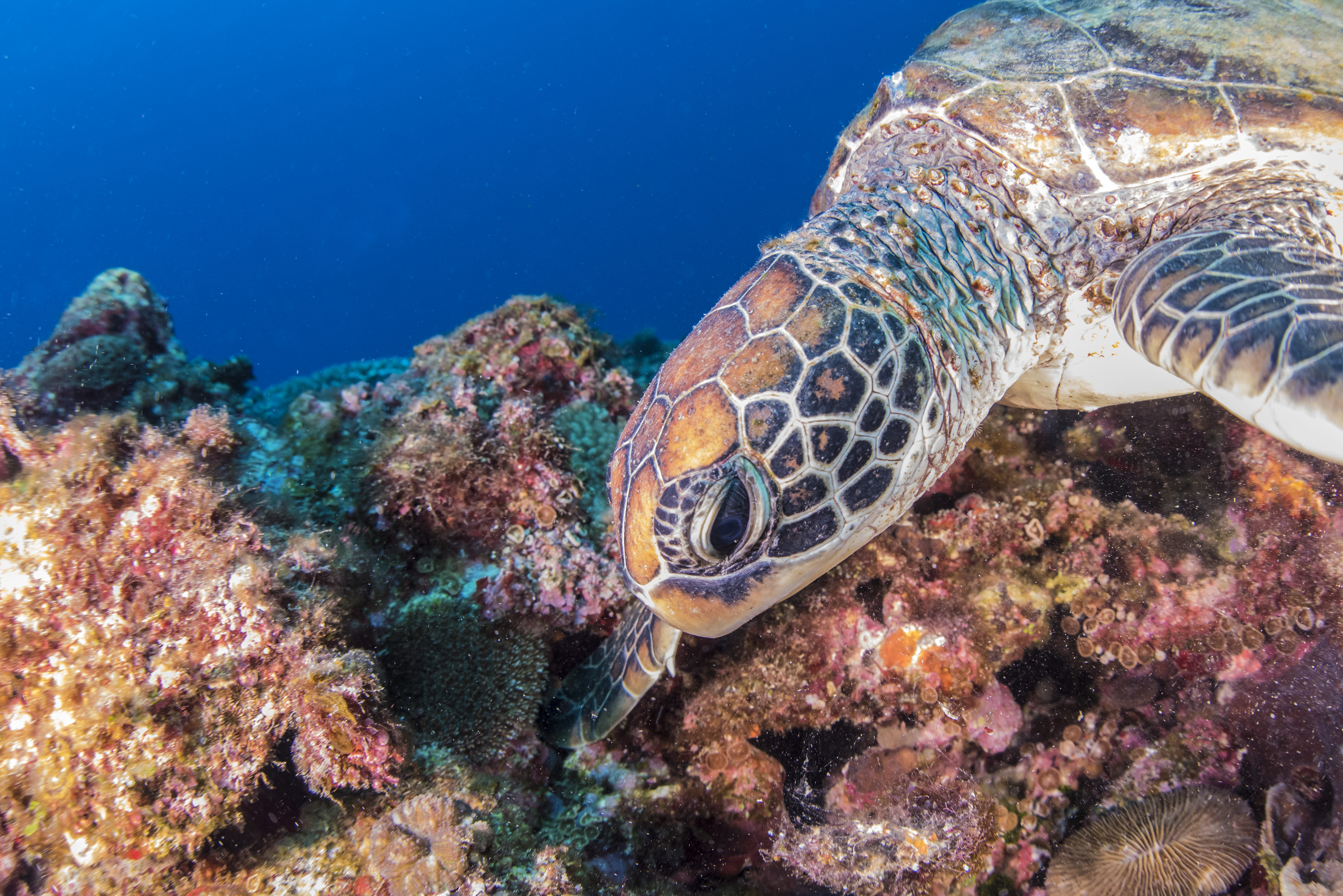 沖縄の珊瑚礁の海を泳ぐ海亀の写真素材です。頭部と甲羅に茶色と白のまだら模様が入り、複雑な幾何学模様の鱗を持つ海亀が、鮮やかな色の珊瑚が群生する海底に向かって泳いでいます。海中での自然な動きを捉えた貴重なショットであり、海の生き物や沖縄の海、ダイビング関連のコンテンツなどに活用できます。