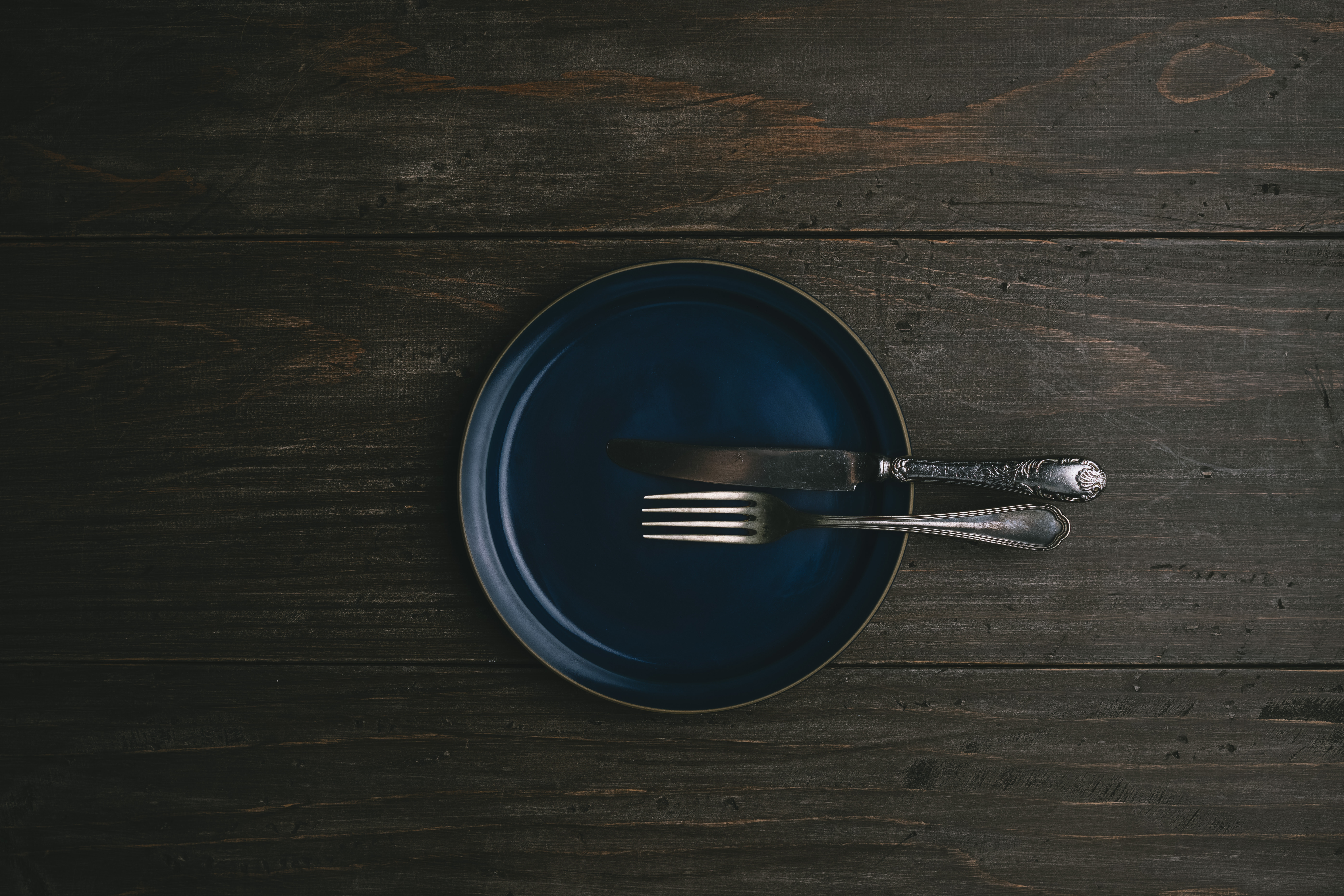 食事を終えたことを知らせるナイフとフォークの置き方の写真素材です。濃紺のプレートの上にシルバーのフォークとナイフが斜めに揃えて置かれ、柄には装飾が施されています。レストランでの食事マナーやテーブルコーディネート、マナー教育などのコンテンツ制作におすすめです。