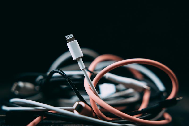 複数のLightningケーブルとUSB-Cケーブルが絡み合った状態の写真素材です。白いLightningコネクタと赤やピンク、黒などのケーブルが重なり、新旧の充電規格が混在する様子が写っています。スマートフォン関連の記事やテック系コンテンツ、規格移行に関する説明資料などにおすすめです。
