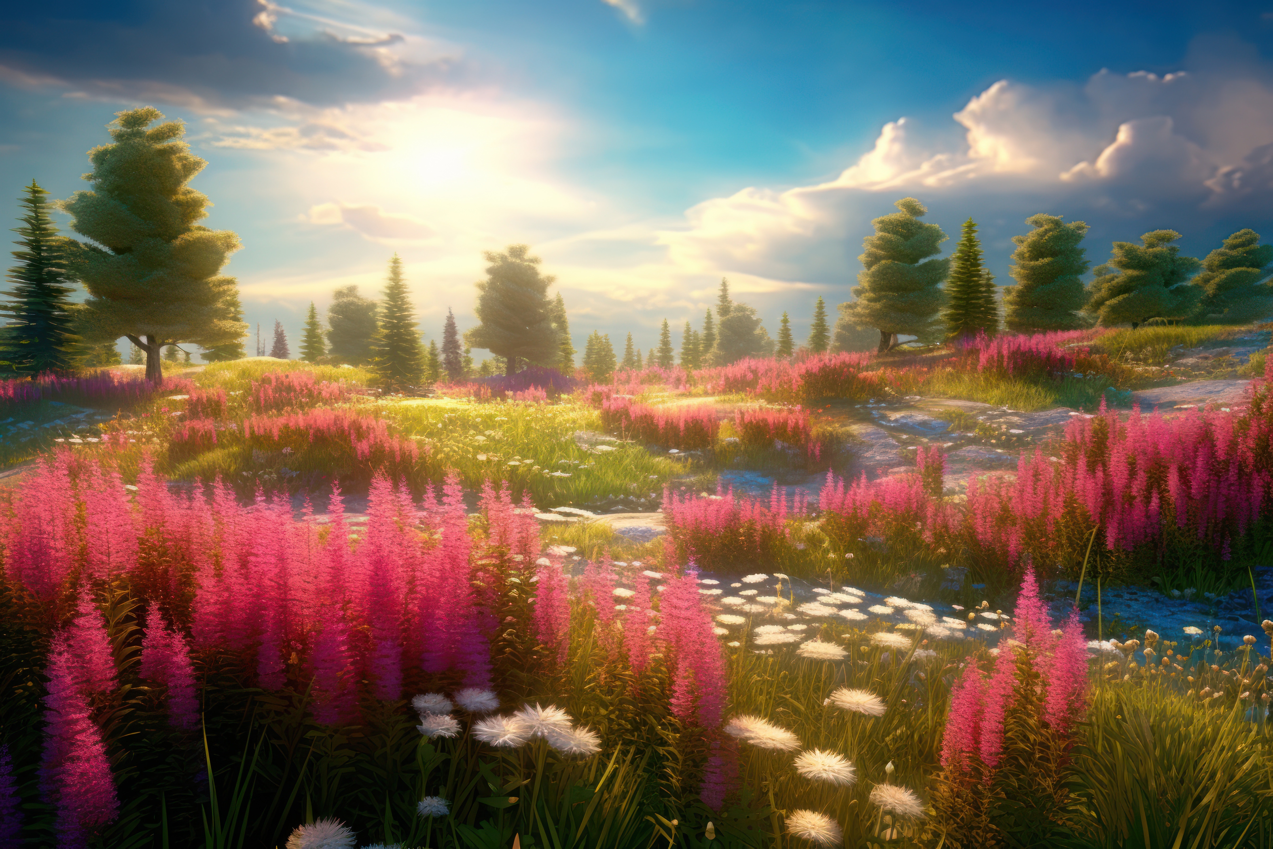 ピンクのルピナスが群生する朝焼けの草原と針葉樹林のAI画像素材(フリー)