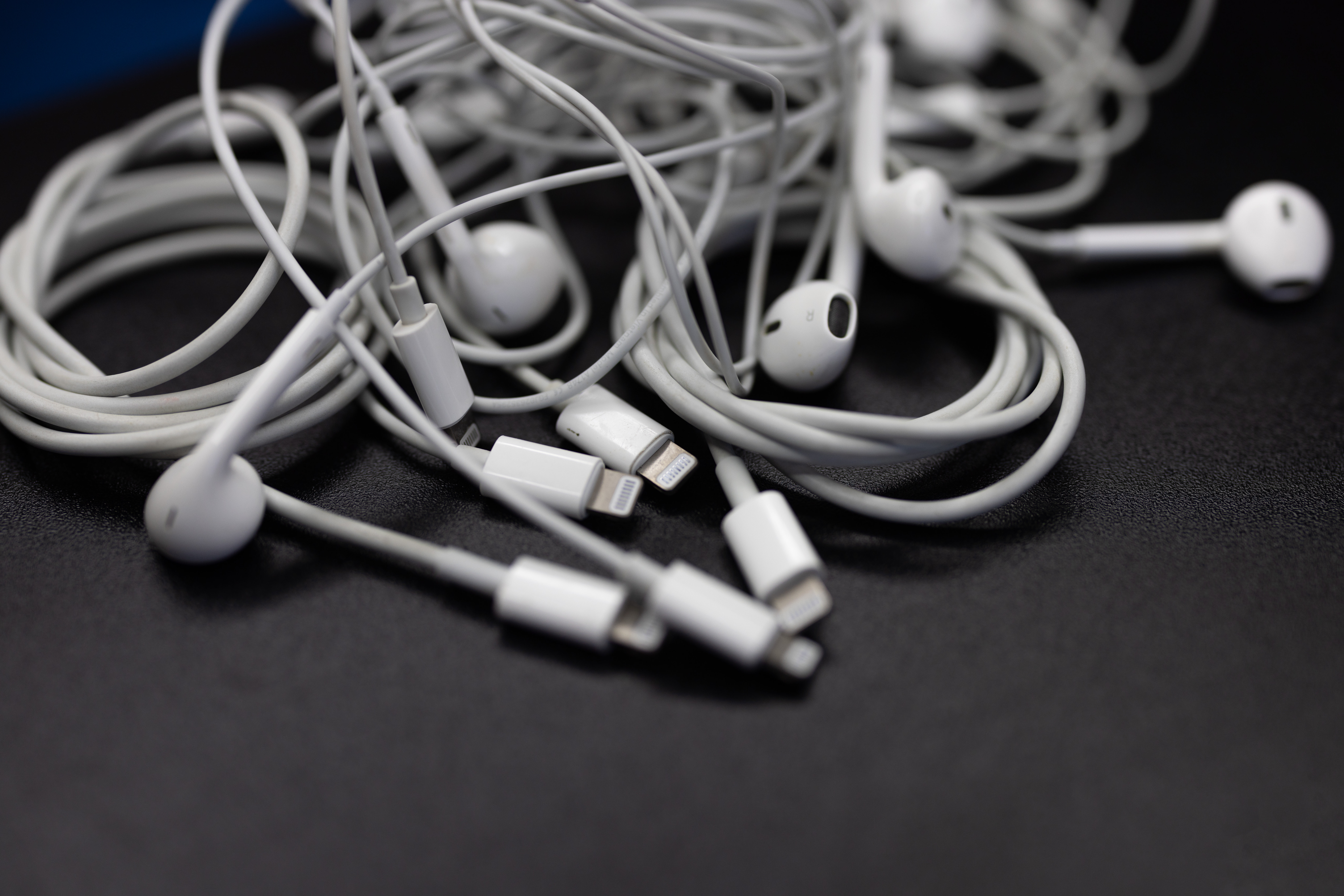 Lightningコネクタ搭載のEarPodsと複数本のケーブルを黒いマット面に配置した写真素材です。白いケーブルが絡み合い、イヤホンのコネクタ部分が立体的に見えています。スマートフォンアクセサリーの紹介やテック関連のコンテンツ、製品比較などにおすすめです。