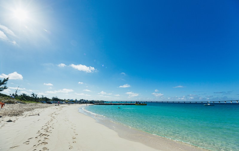 宮古島の前浜ビーチで撮影した写真素材です。白い砂浜に歩いた足跡が点々と続き、透き通ったターコイズブルーの海が広がっています。沖には来間大橋が架かり、海辺の景色や沖縄の観光、旅行、リゾート関連のコンテンツなどにおすすめです。