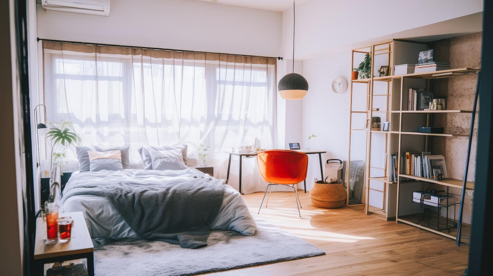 AIで生成したモダンインテリアの寝室の画像素材です。大きな窓から朝日が差し込み、グレーのベッドカバー、オレンジの椅子、木製棚が配置された空間で、半透明カーテンが光を柔らかくろ過します。新生活やインテリア・賃貸物件の紹介素材として活用できます。