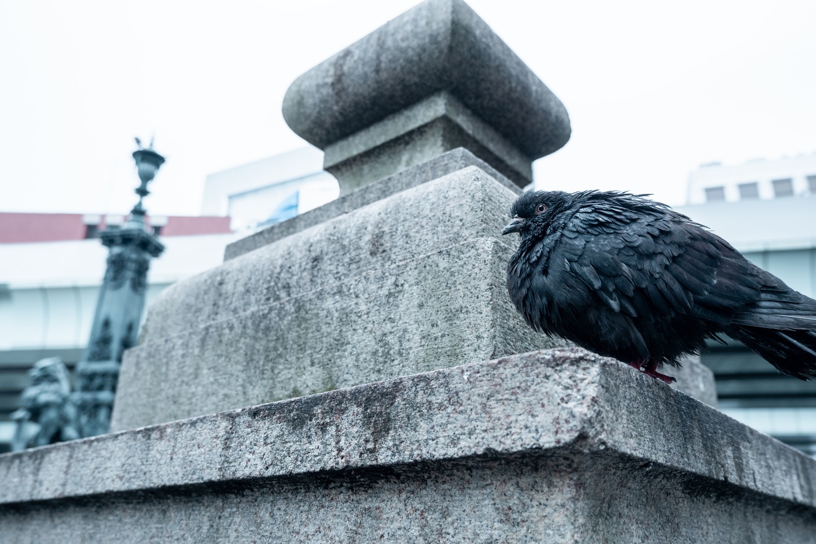 都市の石垣に止まり周囲を警戒する黒い鳩の写真素材です。カワラバト(ドバト)である黒い鳩が、首をすぼめて警戒する様子を捉えており、背景の都市建物との対比で引き立ちます。野鳥や街中の動物、都市風景関連のコンテンツ制作にご活用おすすめです。