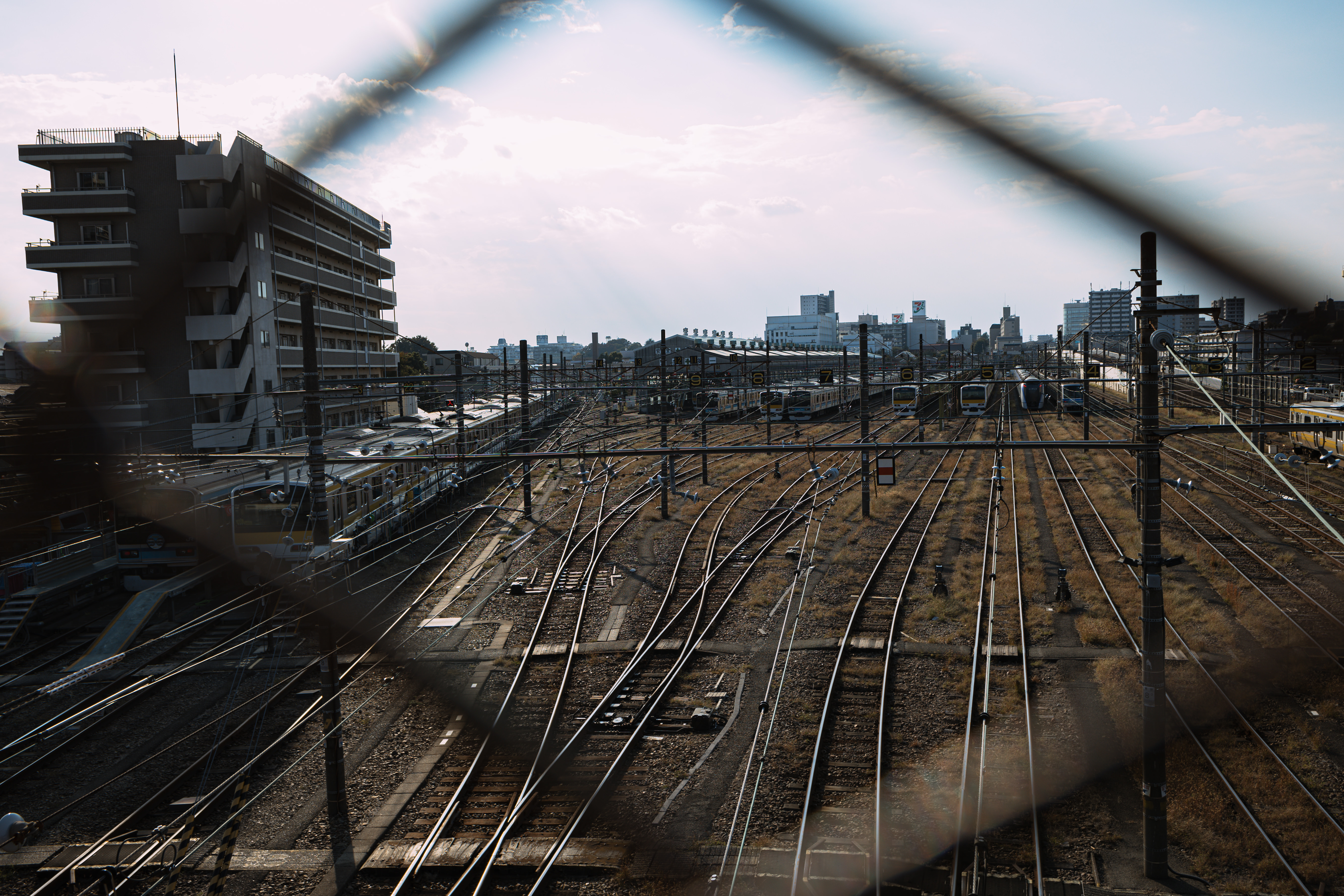JR三鷹駅の陸橋から撮影した車両センターと線路の写真素材です。手前の金網越しに、複数の線路が放射状に広がり、黒い電車が停車し、奥には営団地下鉄の建物や市街地の建物が立ち並んでいます。鉄道関連のコンテンツ、三鷹の名所紹介、都市風景などにおすすめです。