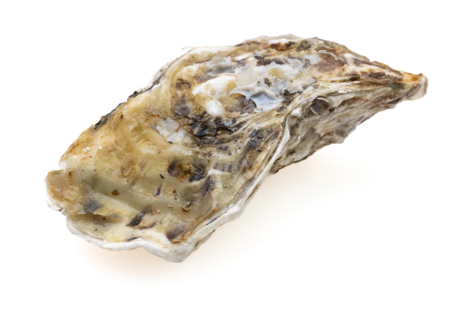 閉じた状態の牡蠣の殻を白背景で切り抜いた写真素材です。ごつごつした粗い質感と斑模様の殻が正面からよく確認できる。食材紹介や海産物の図鑑的なビジュアルにおすすめです。