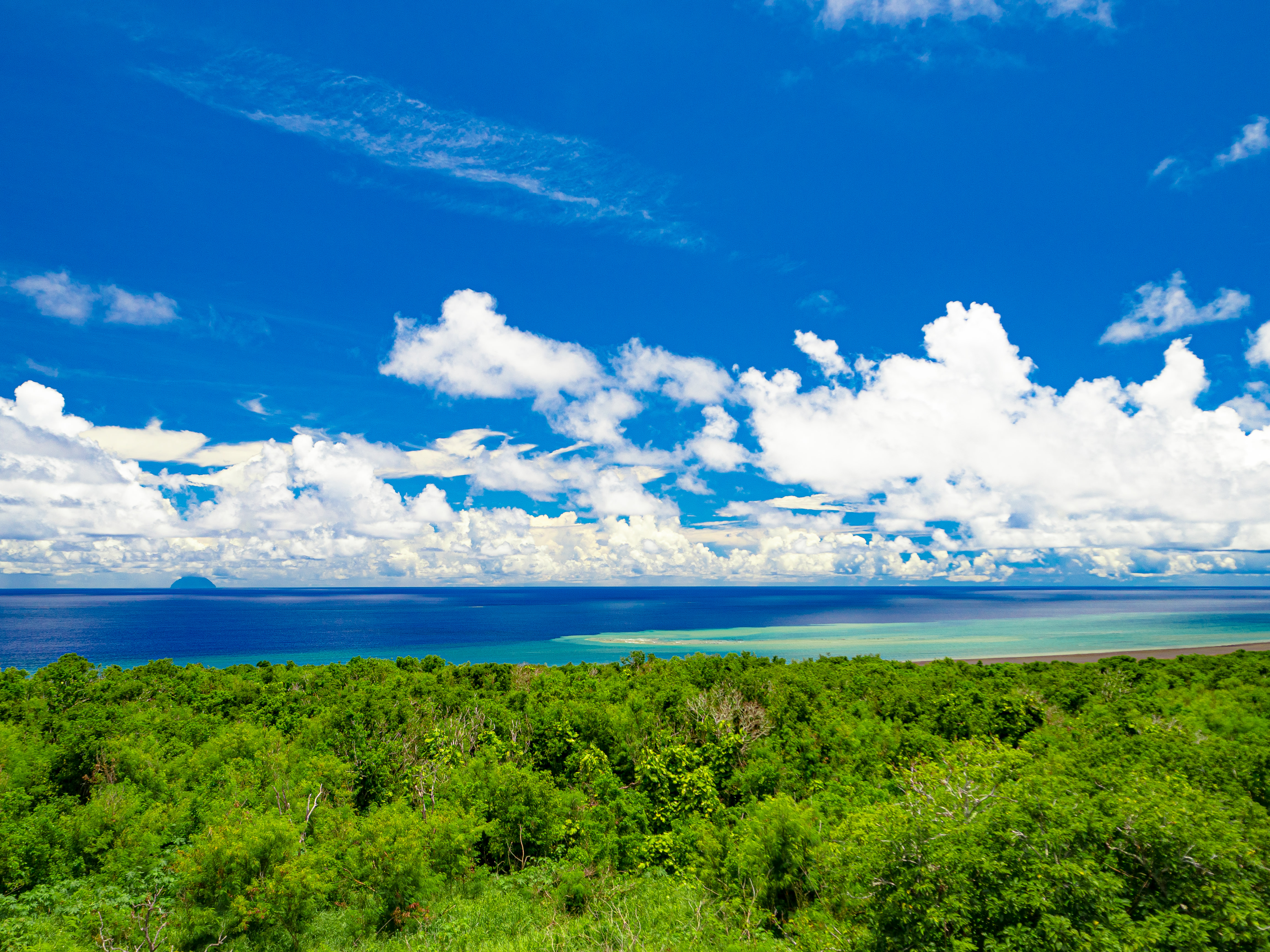海底噴火によって変色した翁浜沖の海域と南硫黄島の写真素材です。手前から奥へ向かう海域が濃い青色から浅緑色へと段階的に色が変わり、遠景には南硫黄島が黒いシルエットで浮かび上がり、その上には白い積雲が広がっています。地質学的な現象や自然科学、火山地形、海洋現象などの学術的コンテンツに最適です。