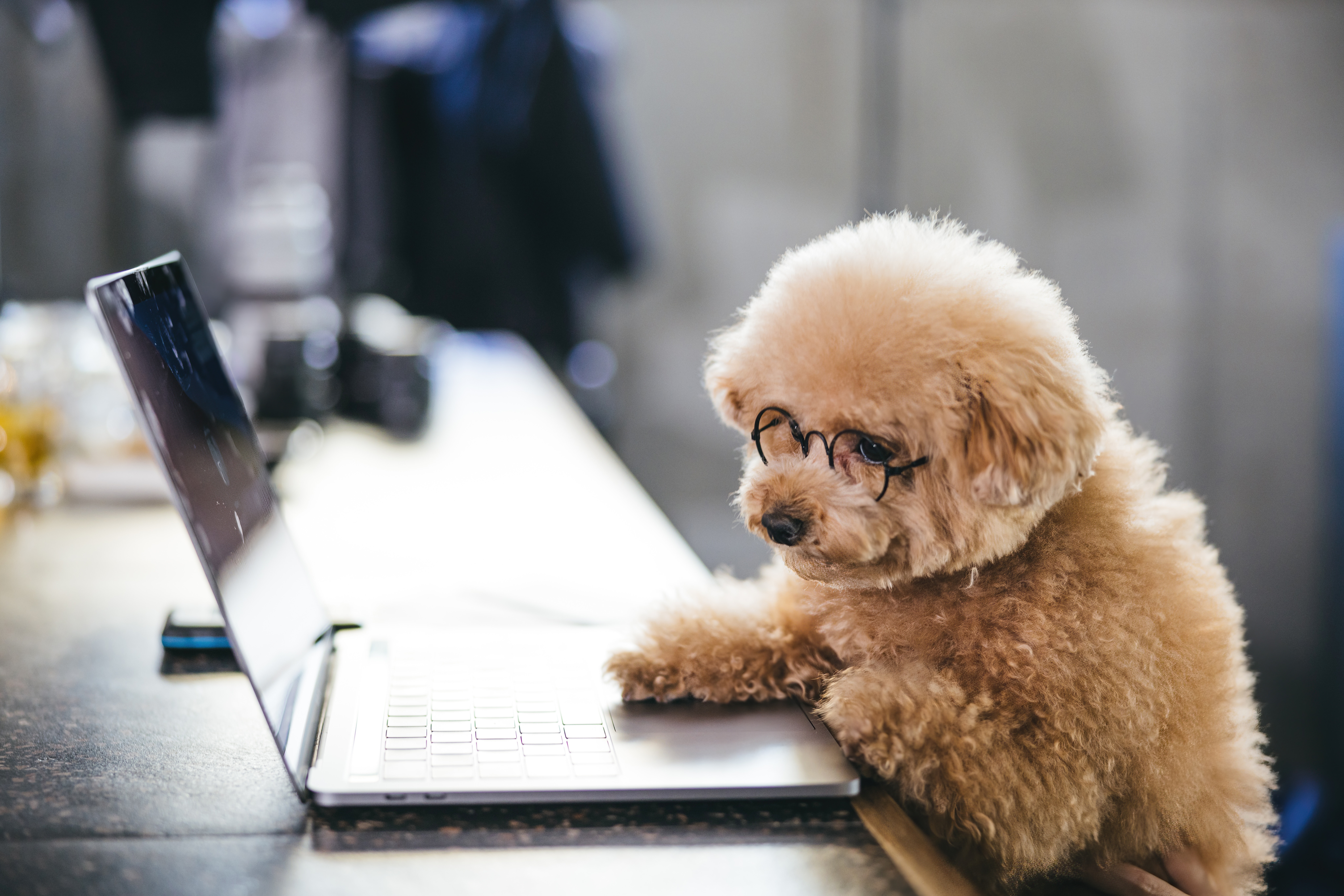 眼鏡をかけたトイプードルがパソコンでテレワークをしている写真素材です。薄いベージュ色の巻き毛の小型犬が黒い眼鏡をかけ、デスクの上に前足を置いてノートパソコンのキーボードに向かっています。ペット関連のコンテンツやユーモア系のWebサイト、SNS投稿などにおすすめです。