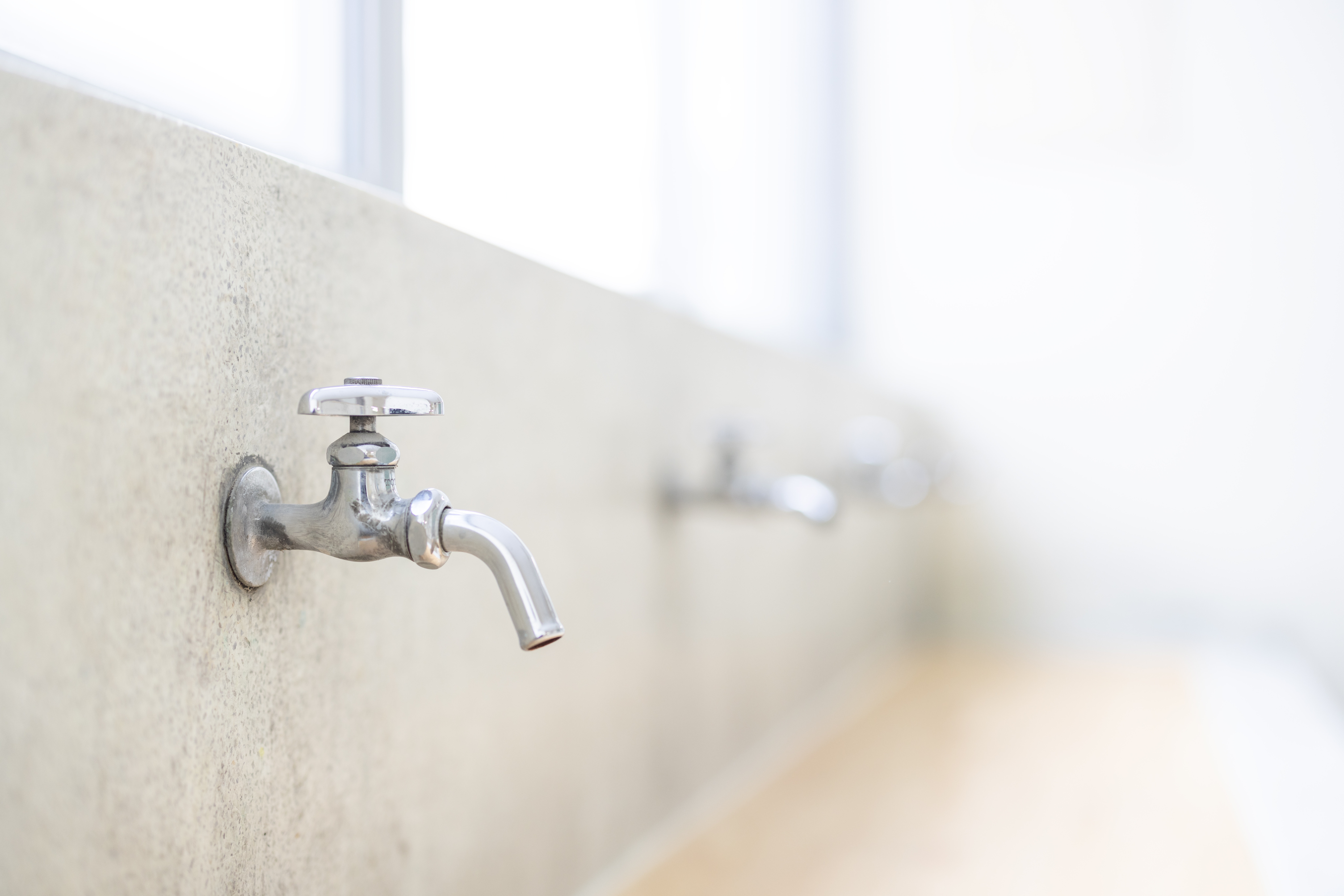 廃校舎の壁に取り付けられた水飲み場の蛇口の写真素材です。経年劣化した灰白色のコンクリート壁に金属製の蛇口が横向きに設置され、ハンドルは銀色に輝いており、学校施設が機能していた時代の痕跡を留めています。学校施設の記録や廃墟の記事、地域の歴史関連のコンテンツなどにおすすめです。