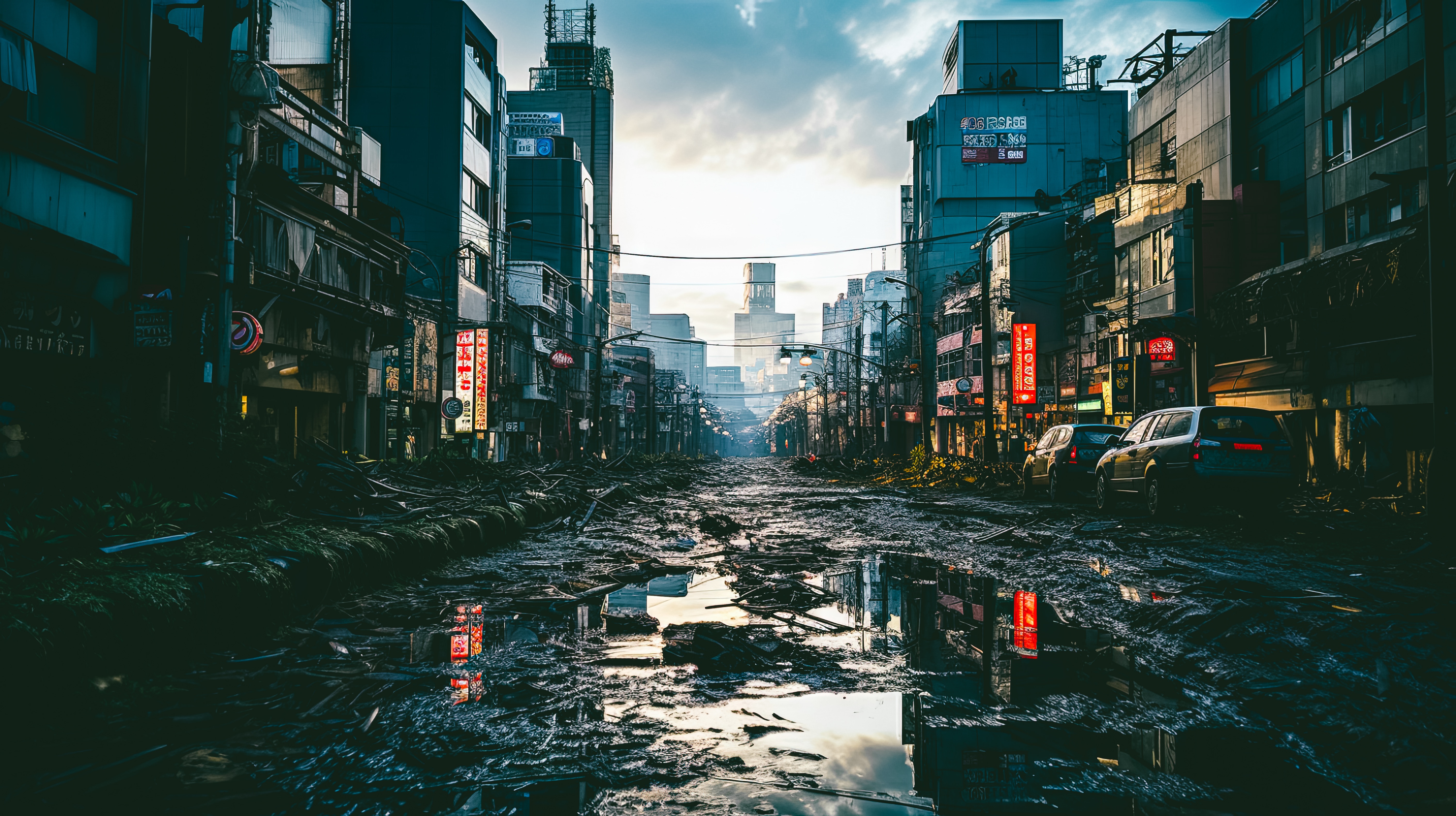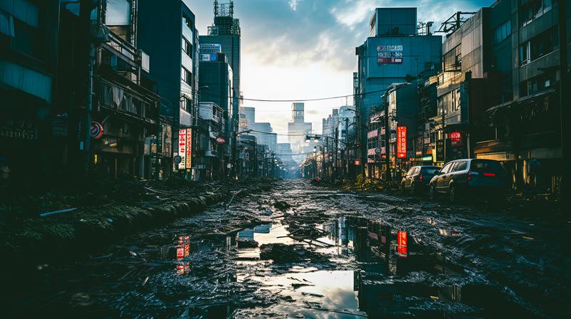 AIで生成した崩壊した都市の画像素材です。瓦礫が散乱した道路の両脇に損壊した建物が立ち並び、赤い看板が薄暗い光の中で反射しており、奥には曇った空が広がっています。滅亡後の世界観を表現した素材で、サバイバルやポストアポカリプスをテーマにした創作物に活用できます。