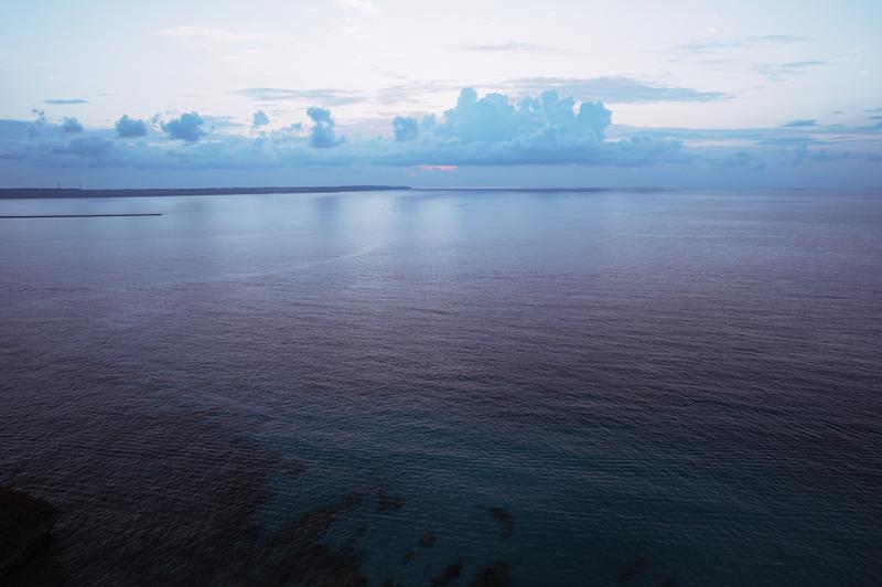 砂山ビーチからの夕暮れ時の海の写真素材です。穏やかな海面に光が映り、白い積雲が浮かぶ地平線を背景に、空は薄紫から薄ピンクへと優雅にグラデーションしています。宮古島の自然風景を活かした観光地紹介やブログ、旅行関連のWebサイト制作におすすめです。