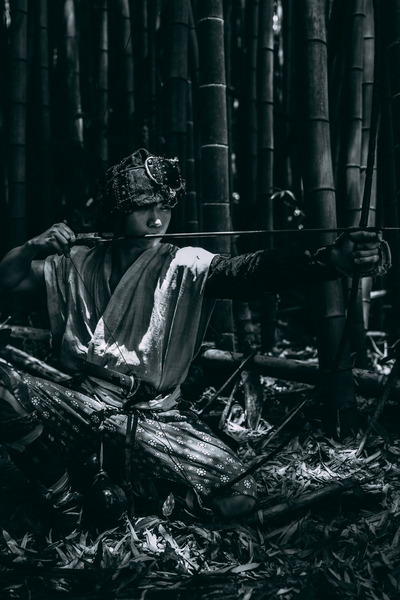 竹林の暗がりで大弓を引く野盗の写真素材です。編み笠をかぶり白い腹巻のような布を巻いた男性が、太い竹に囲まれた林の中で大弓を横に構え、集中した表情で前方を見据えています。時代劇や歴史設定のコンテンツ、ゲーム素材、映像制作などにおすすめです。