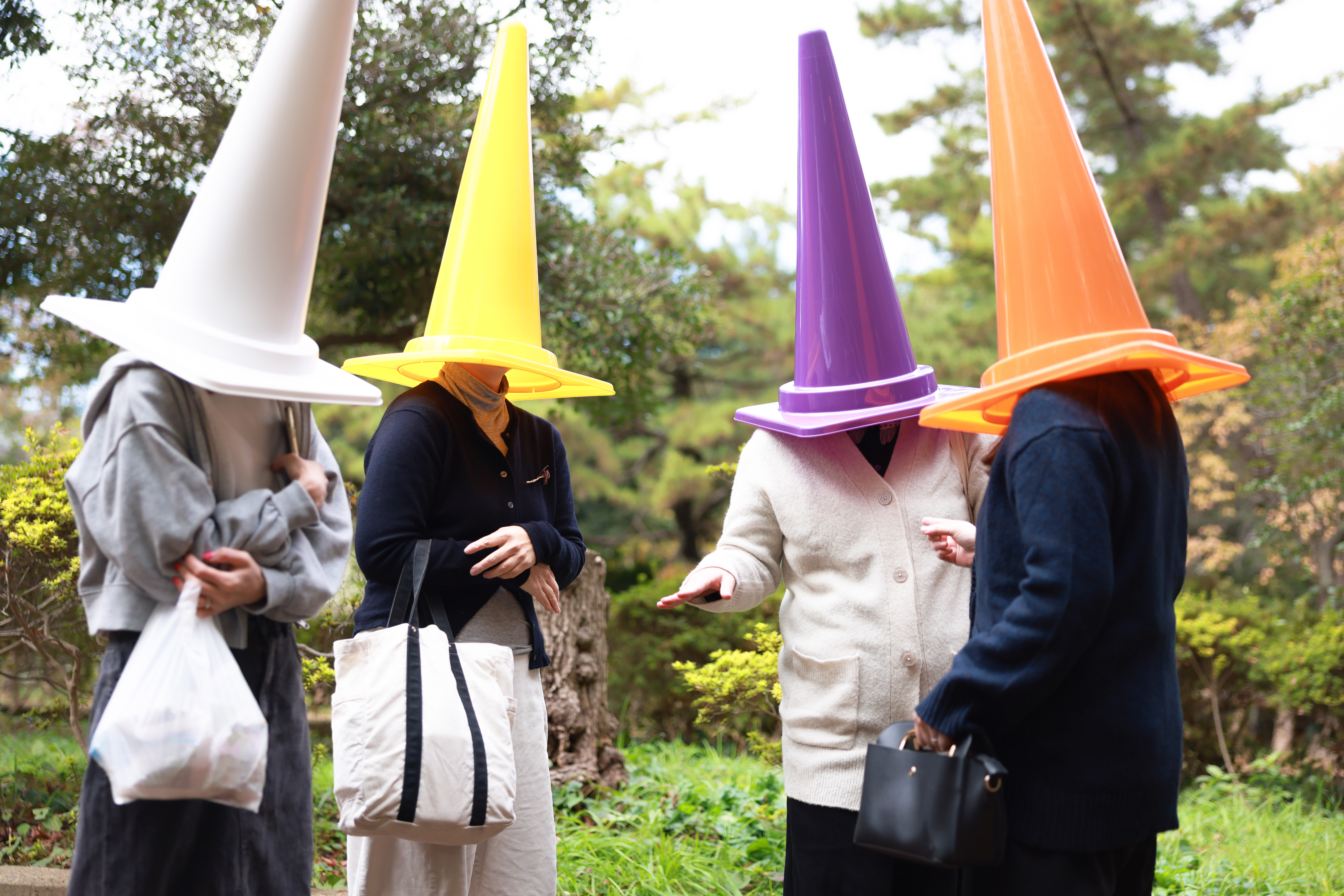 道路脇で三角コーン被りの女性たちが集まって話をしている写真素材です。白、黄、紫、オレンジの大きな三角コーンを被った4人の女性が、緑の草木が背景にある屋外で立ち話をしており、各々バッグを持ったり手を動かしたりしながら会話をしています。ユーモアやコミュニティネタ、社会風刺系のコンテンツ制作などにおすすめです。