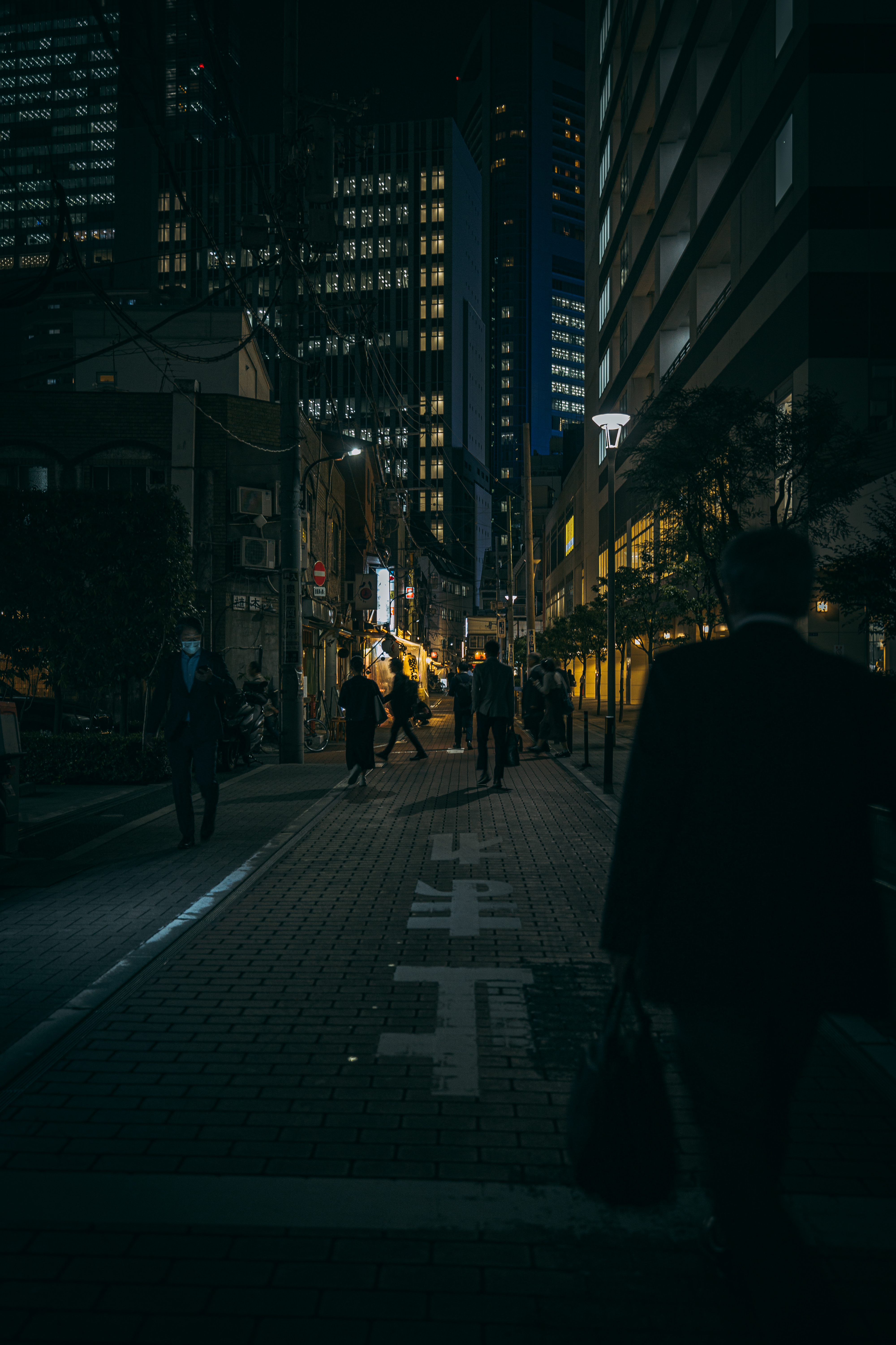 夜の新橋の路地を帰宅するサラリーマンたちの写真素材です。高層ビルが立ち並ぶ中、煉瓦造りの歩道を数人の会社員が歩いており、ビルの窓から漏れる灯りが路地全体を照らしています。新橋のビル群に囲まれた夜間のシーンで、仕事帰りの風景や都市風景、夜間の街並み表現におすすめです。