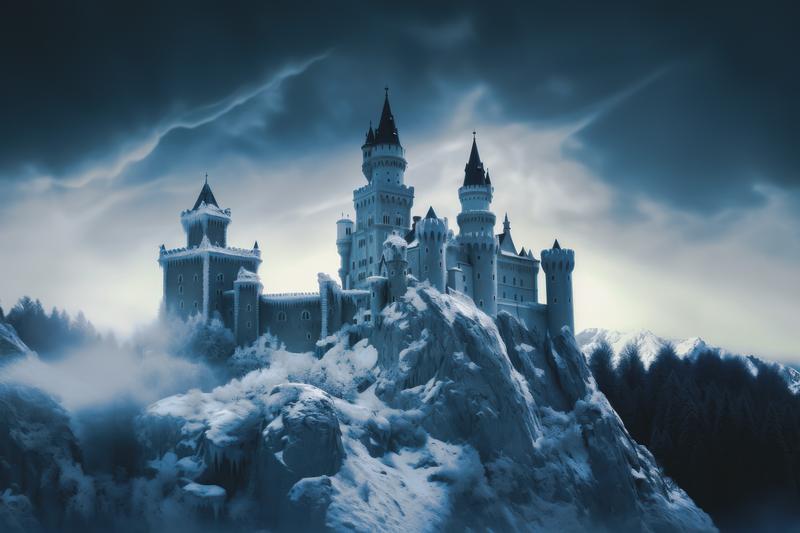 AIで生成した雪化粧の城のような画像素材です。山頂に聳える複数の塔を持つ白と薄い青色の城が、積雪に覆われた岩肌の上に厳然と立ち、周囲は濃い雲と雪に包まれた銀世界となっています。ファンタジー小説の挿絵や冬のゲーム背景、童話の舞台設定などに活用できます。