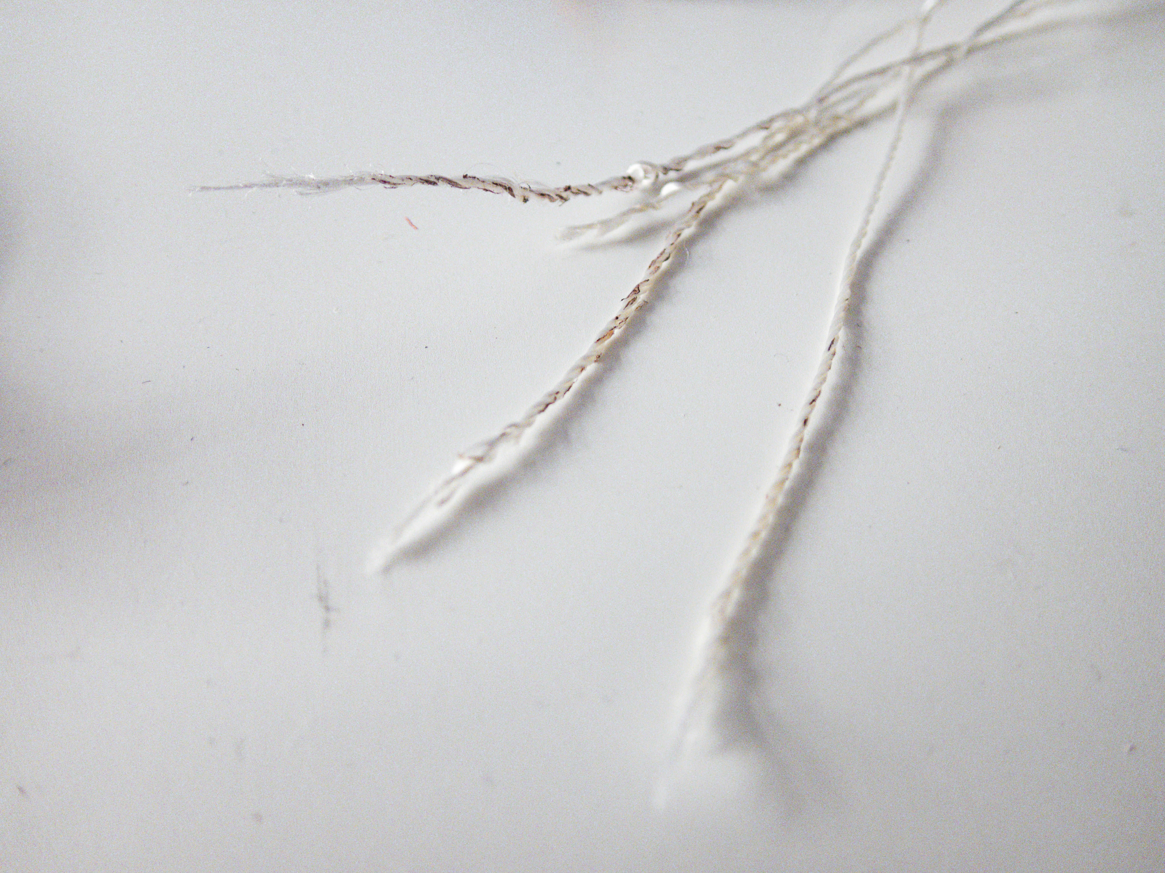 ほつれたパラコードの写真素材です。白い束ねたコードが複数本に分かれ、一部は力で引き裂かれたように破断しており、毛羽立った繊維が露出しています。素材の劣化や強度低下の表現、危険な状態の表現、製品品質関連のコンテンツなどにおすすめです。