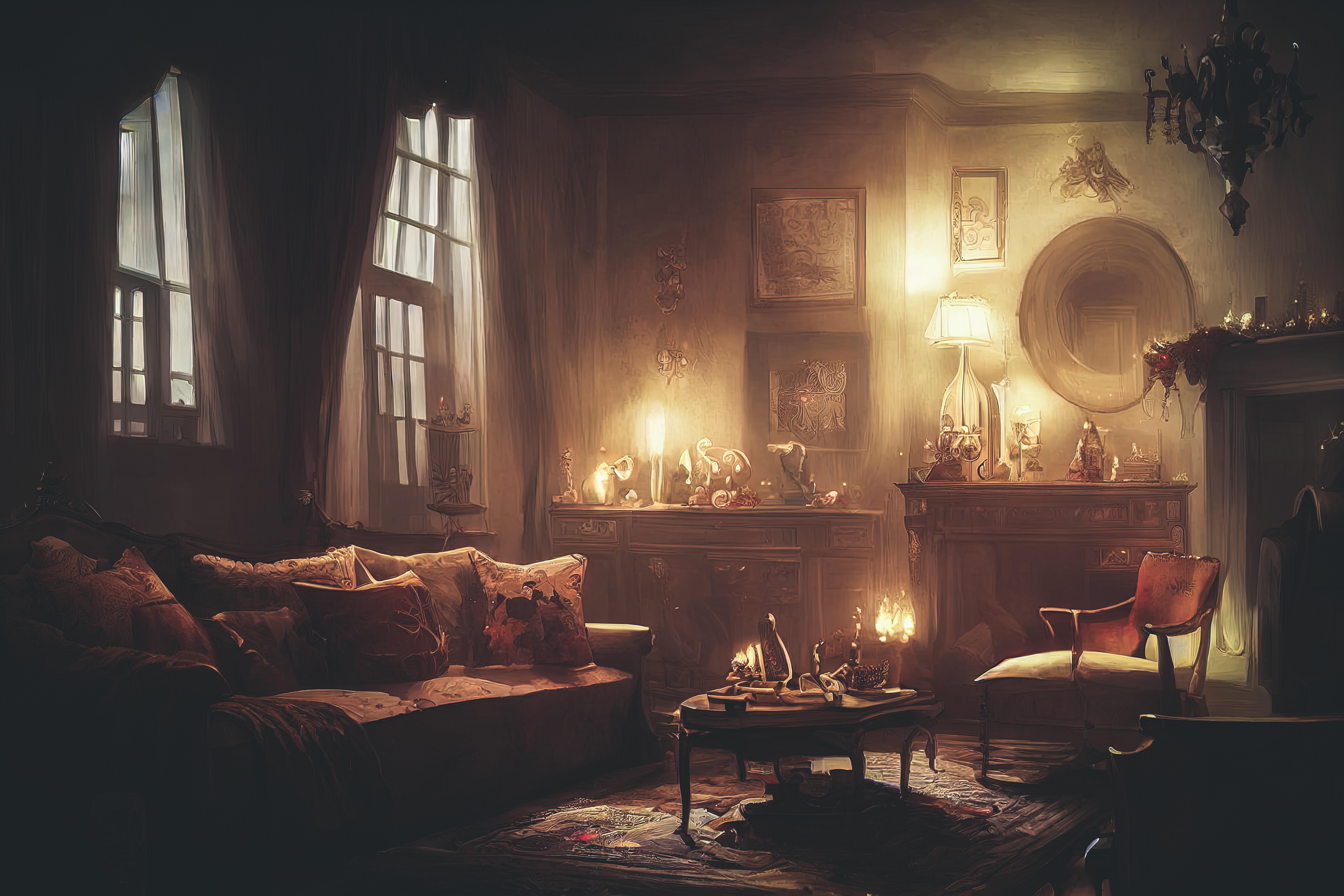 AIで生成したアンティーク調リビングの画像素材です。キャンドルやランプの暖色の光が室内を照らし、骨董品や絵画が並ぶサイドボードと暖炉がある。レトロなインテリアや西洋クラシック調のデザインにおすすめです。