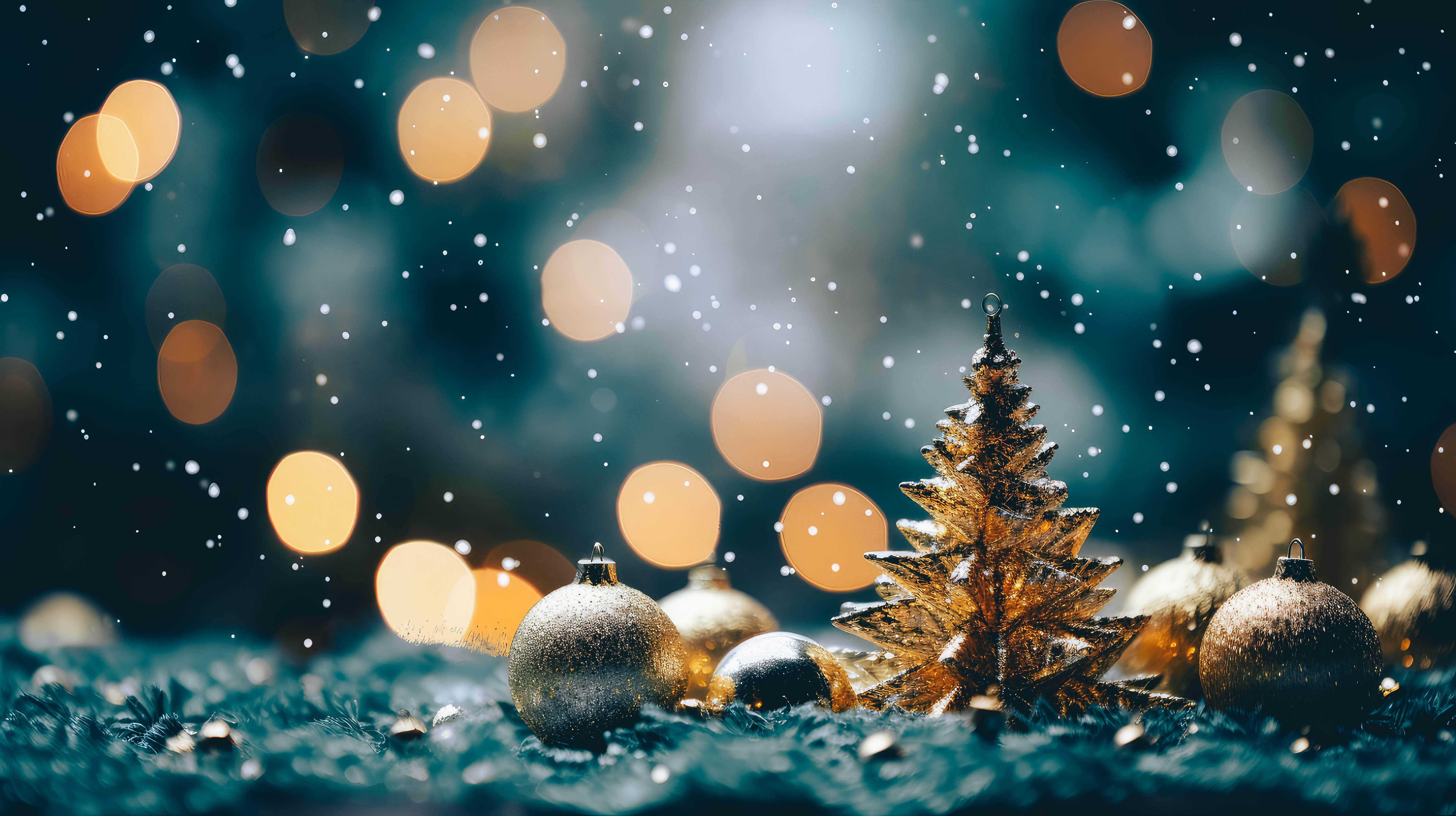 AIで生成したクリスマスの雰囲気を表現した画像素材です。深緑の背景に温かみのあるゴールド色の大小のボケが浮遊し、手前ではシルバーとゴールドのオーナメントやゴールド色のクリスマスツリー、粉雪のような装飾が配置されています。クリスマス関連のデザインやポストカード、販促資材への活用におすすめです。