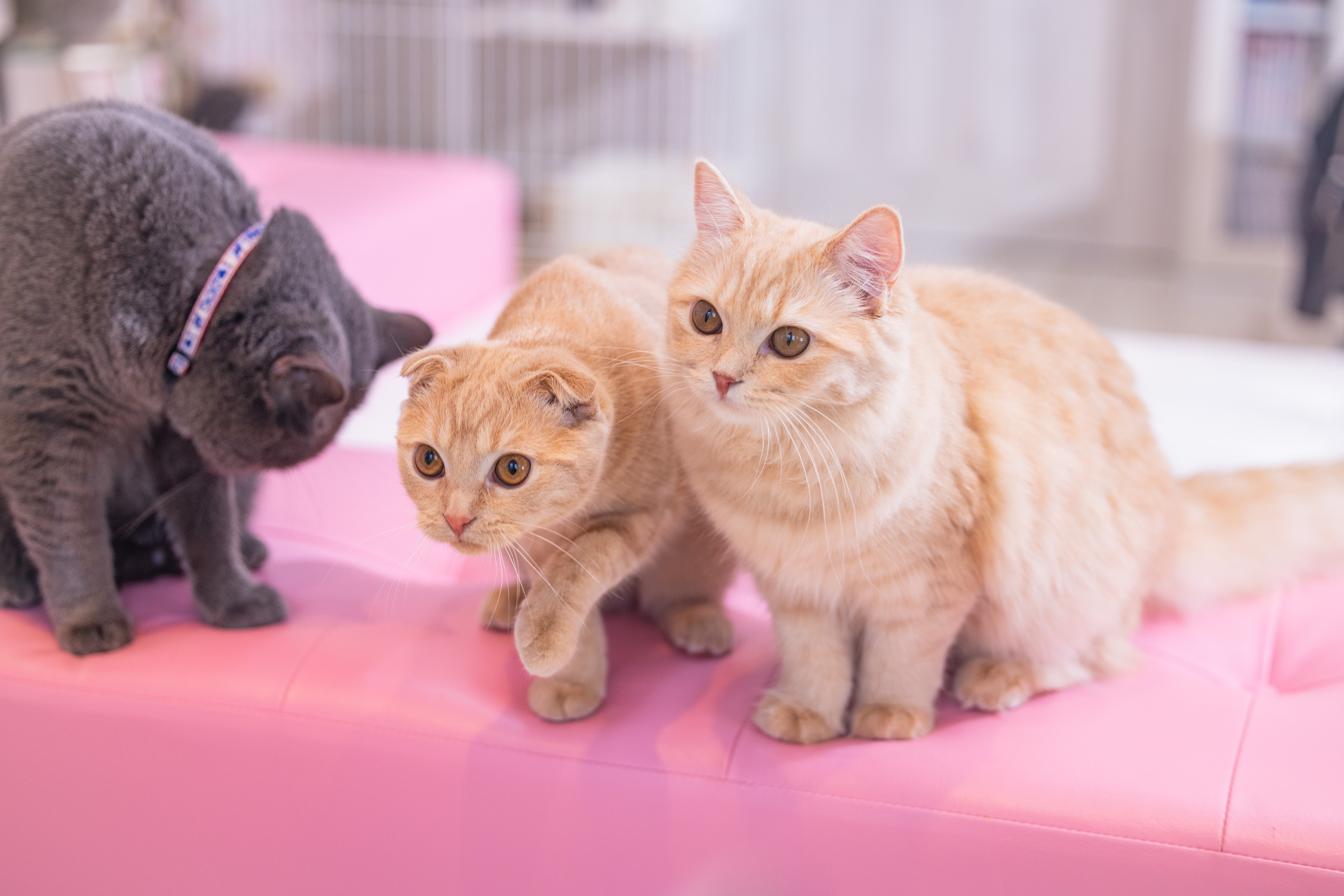 ピンク色の床で遊ぶ仲良しのスコティッシュフォールドの写真素材です。クリーム色とオレンジ色の毛並みの子猫2匹と、グレーの子猫1匹が一緒にいる様子で、全員がカメラを向いています。ペット関連のWebサイトやブログ、キャットフード、ペット用品の広告やSNS投稿素材などにおすすめです。