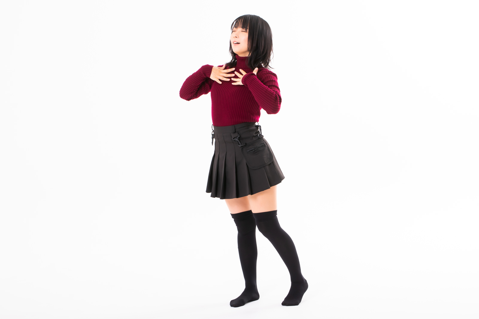 赤紫のニットとプリーツスカートを着た女性が胸を張るポーズをとっている写真素材です。両手を胸に当てながら上半身を起こし、視線は上向きで、黒いタイツと合わせたコーディネートで立っています。ポーズ集、ファッションコンテンツ、広告制作やWebサイトの女性モデル素材としておすすめです。