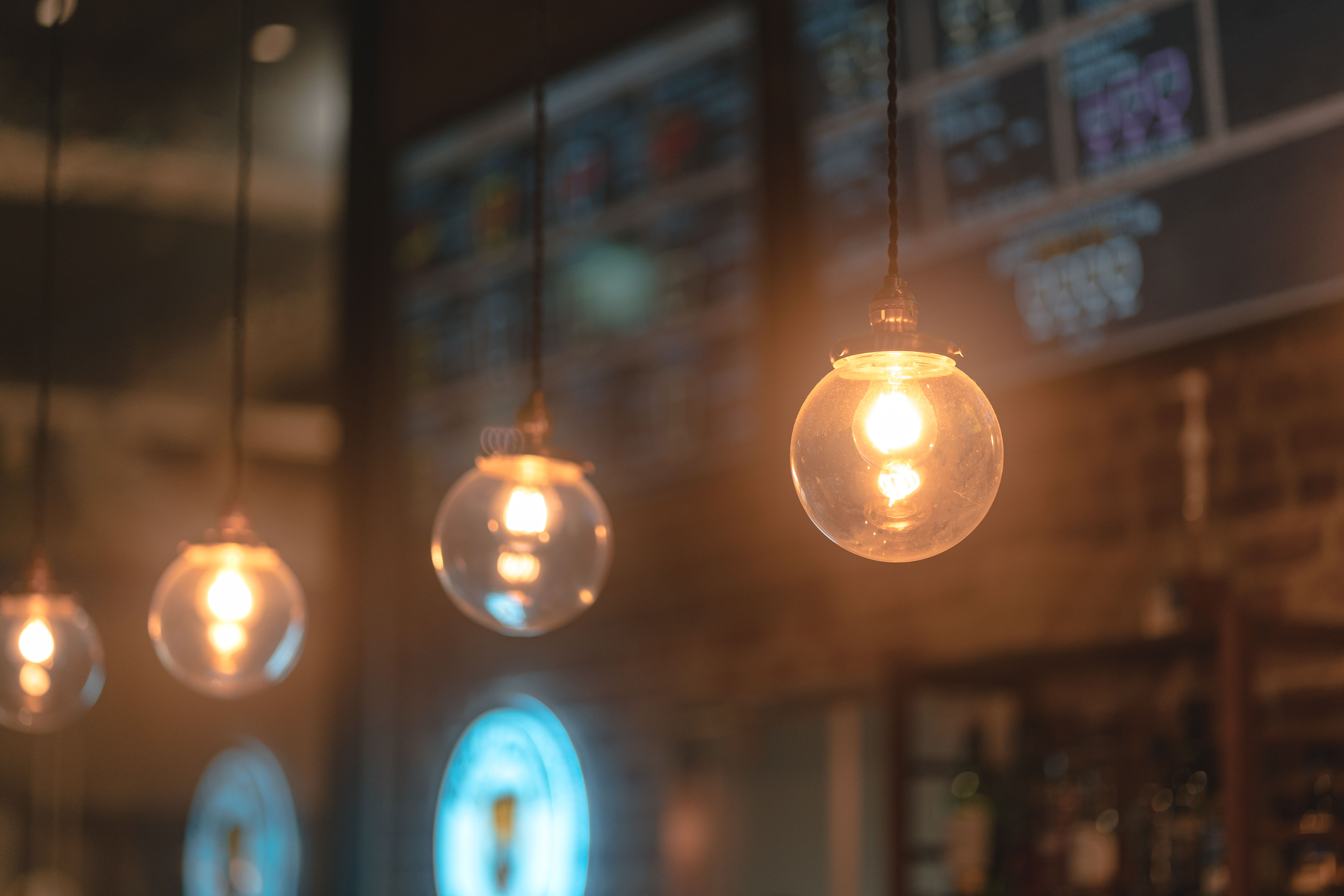 球体のペンダントライトが複数吊り下げられた照明の写真素材です。透明なガラス製のシェード内に白熱電球が入り、温かみのあるオレンジ色の灯りが点灯しています。背景にはカフェやレストランの店内がぼけて映っており、照明デザインやインテリアコーディネート、飲食店の紹介におすすめです。