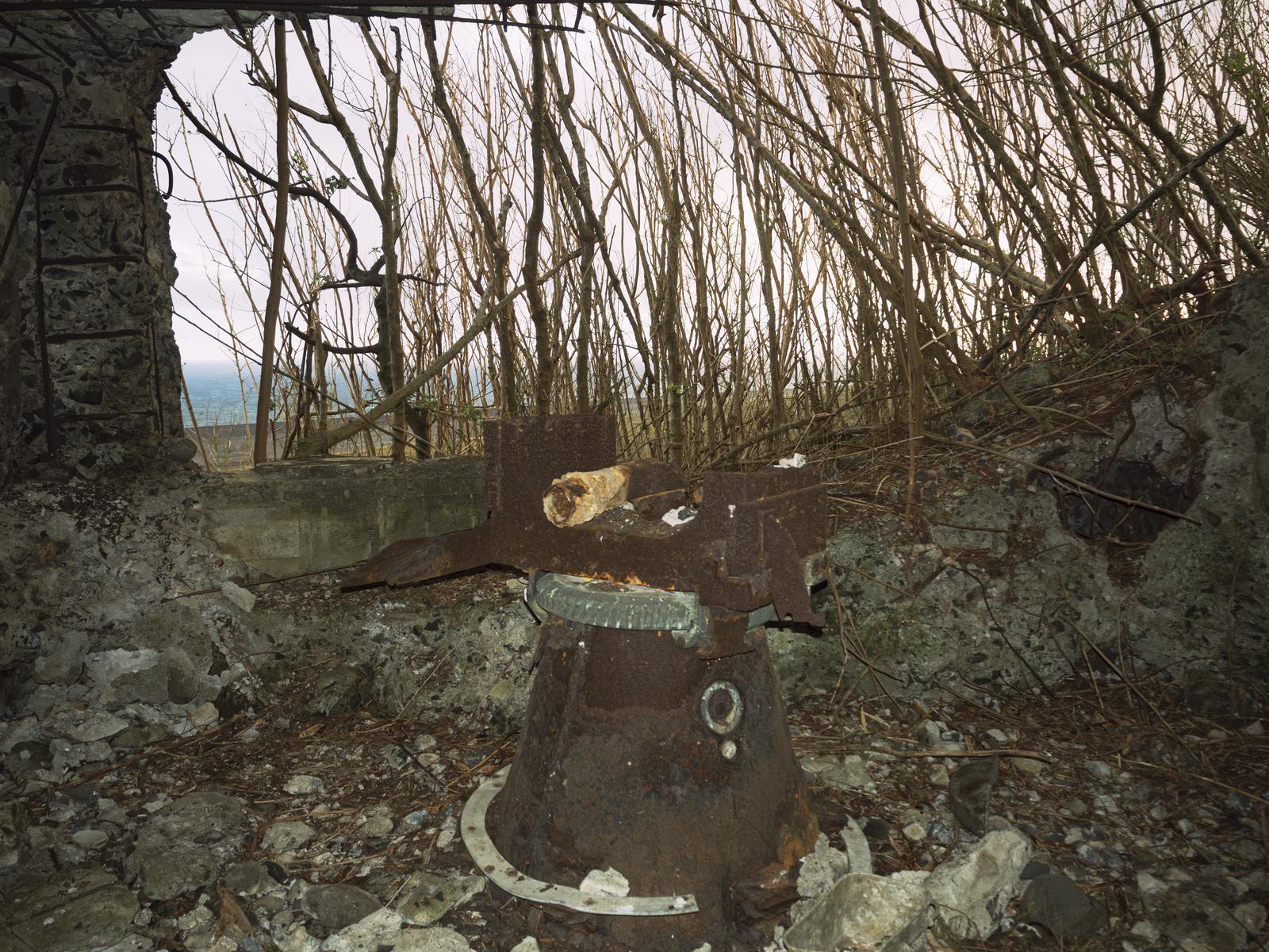 硫黄島の海軍南地区砲台群内部に残る12糎砲砲座の写真素材です。コンクリート製の砲座跡が地面に埋め込まれており、周囲には赤さびた金属部品が散在し、樹木が根付き繁茂しています。太平洋戦争の歴史を物語る重要な軍事遺構として、戦争遺跡や歴史学習、戦跡紀行などのコンテンツに最適です。