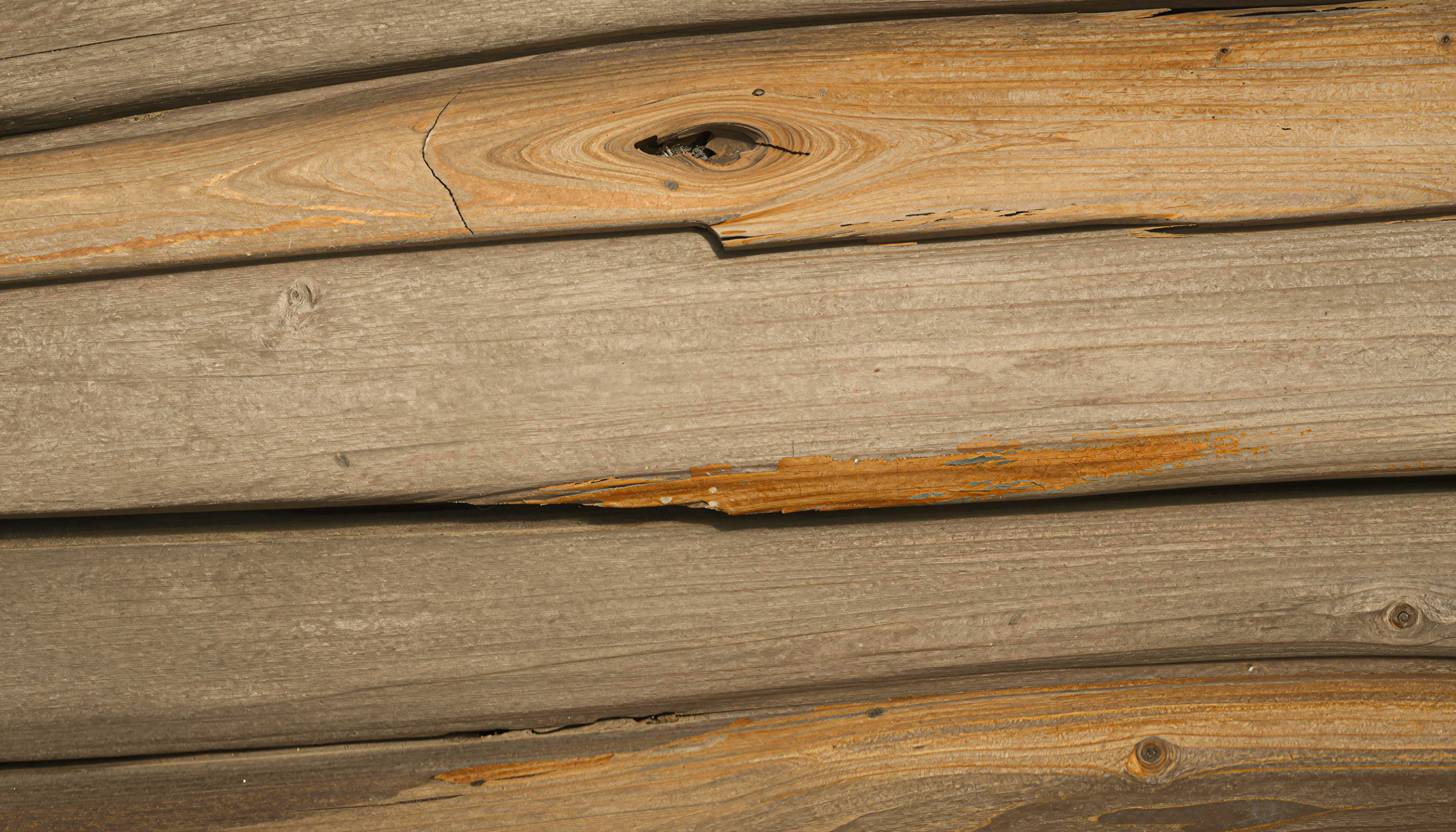 横に重なった古い木材の板に節穴とささくれが見えるAI画像