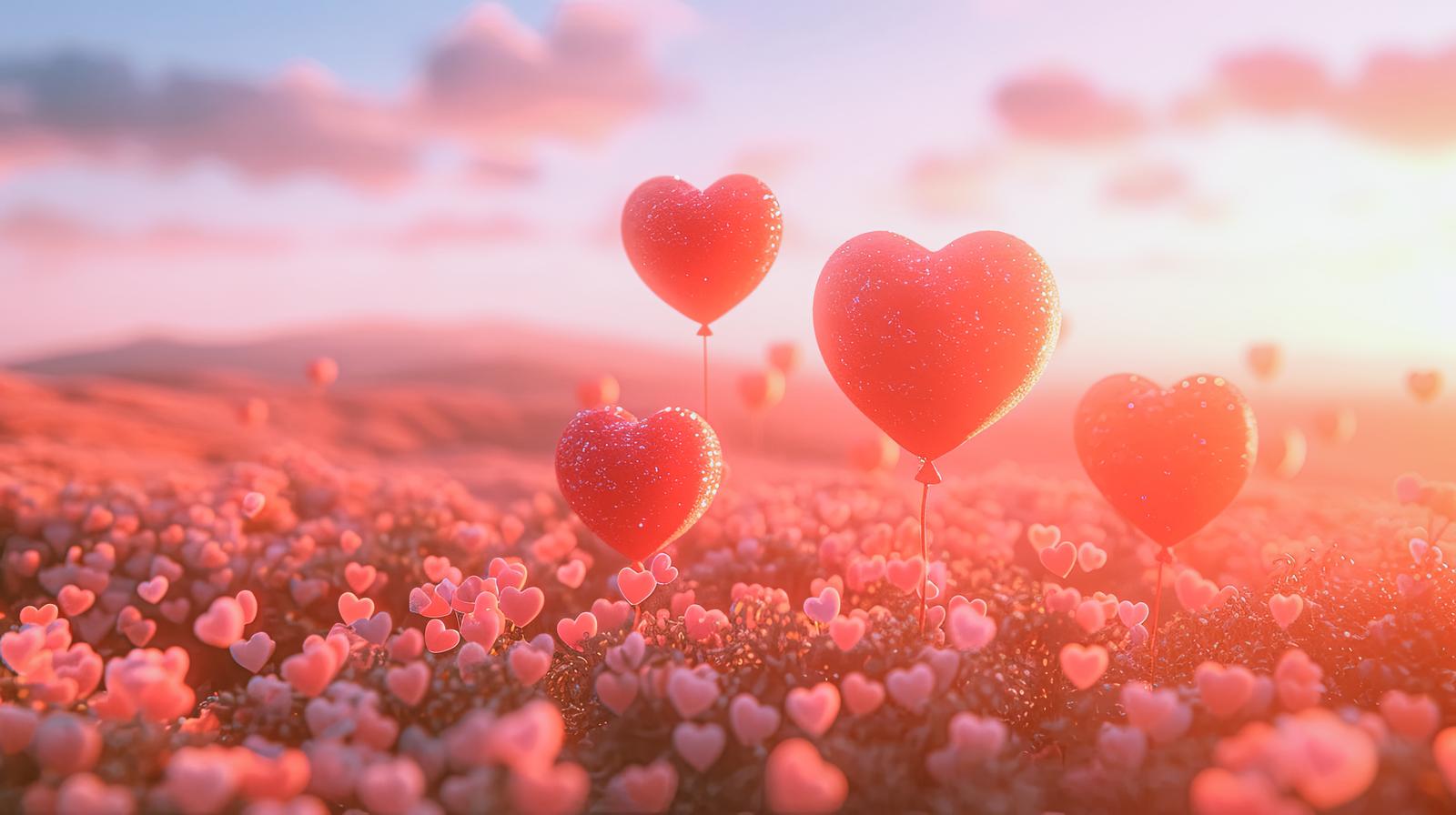 ハート風船が浮かぶハート畑、バレンタインデーのロマンチックな愛情表現のAI画像素材(フリー)