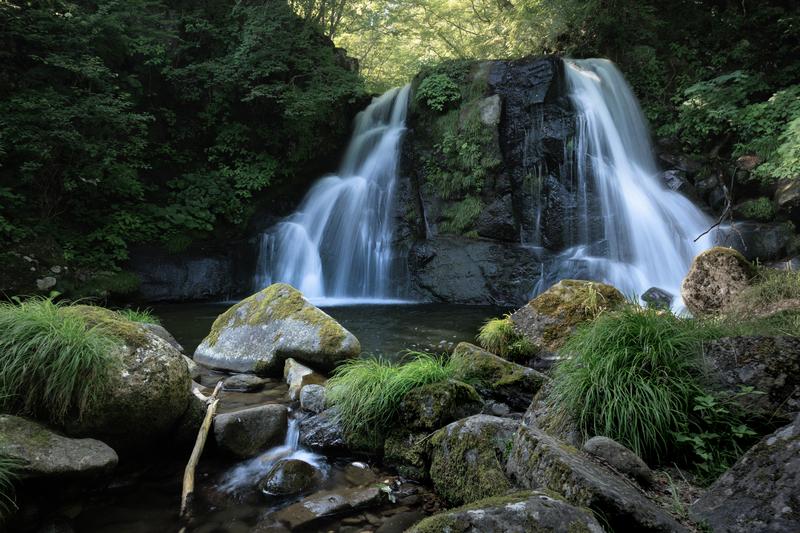 天栄村の明神滝を水源とする渓流の写真素材です。黒い岩肌に苔が生え、左右の岩から白く落下した水が滝壺に流れ込みます。手前には苔むした大きな岩と緑の雑草が群生する流れが広がり、観光地紹介や旅行ブログ、自然風景のWebサイト制作などにおすすめです。