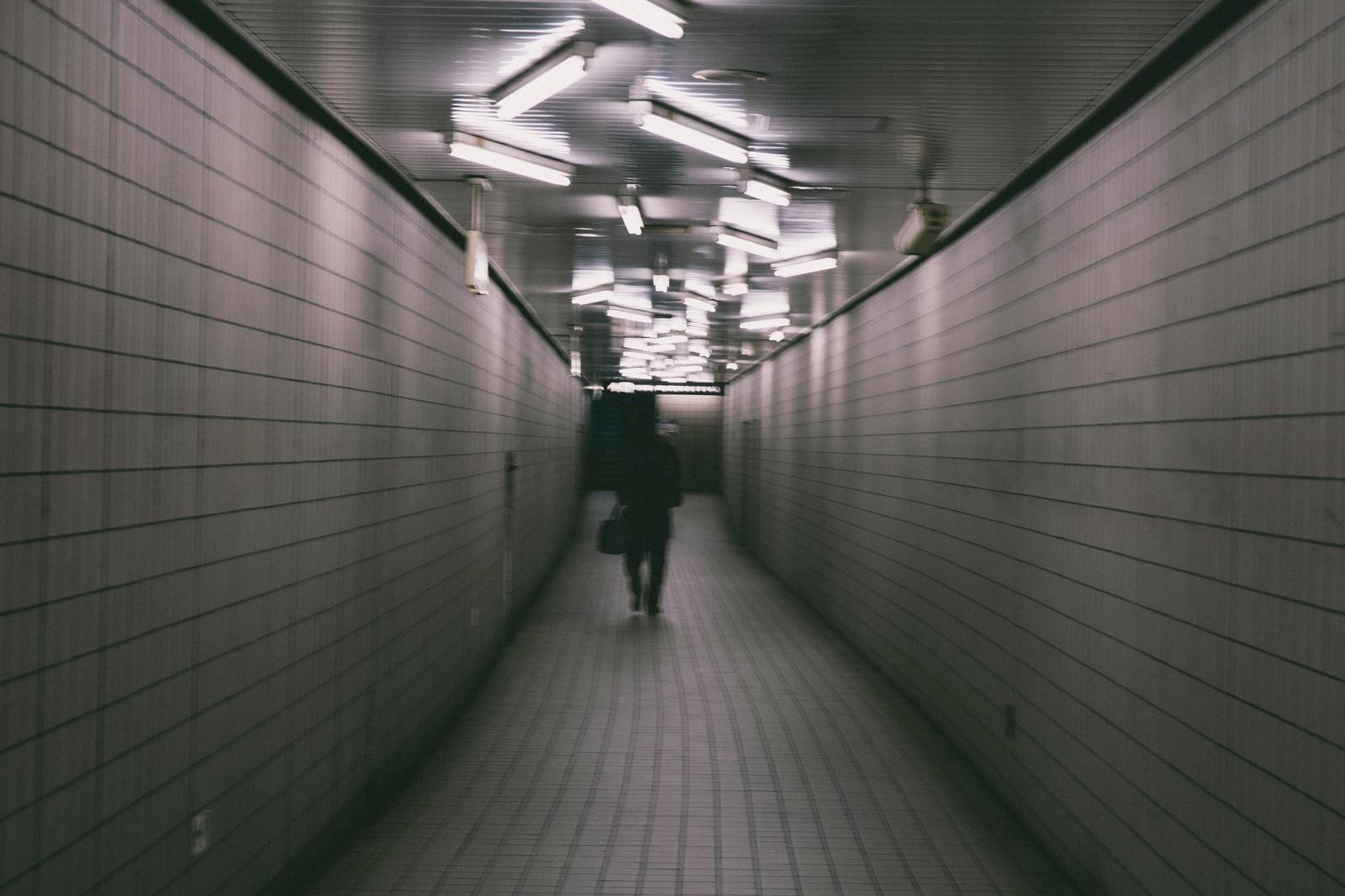 清澄白河駅のA3出口から駐輪場へ続く地下通路の写真素材です。白いタイル張りの壁が両側に立ち並び、天井の蛍光灯が列を成して奥へ伸びています。駅構内や地下街の独特な不気味な雰囲気が感じられ、脱出テーマのコンテンツ制作に活用できます。