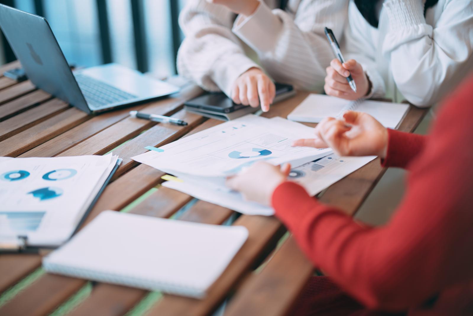 グラフが印刷された資料を前にして会議をする複数人の手元の写真素材です。白シャツの人物がペンを持ち資料を指し、赤いジャケットの人物も資料に手を置きながら、木製のテーブルの上に広げられた複数の数字グラフを見ています。ビジネス会議やチームミーティング、企業研修のコンテンツなどにおすすめです。