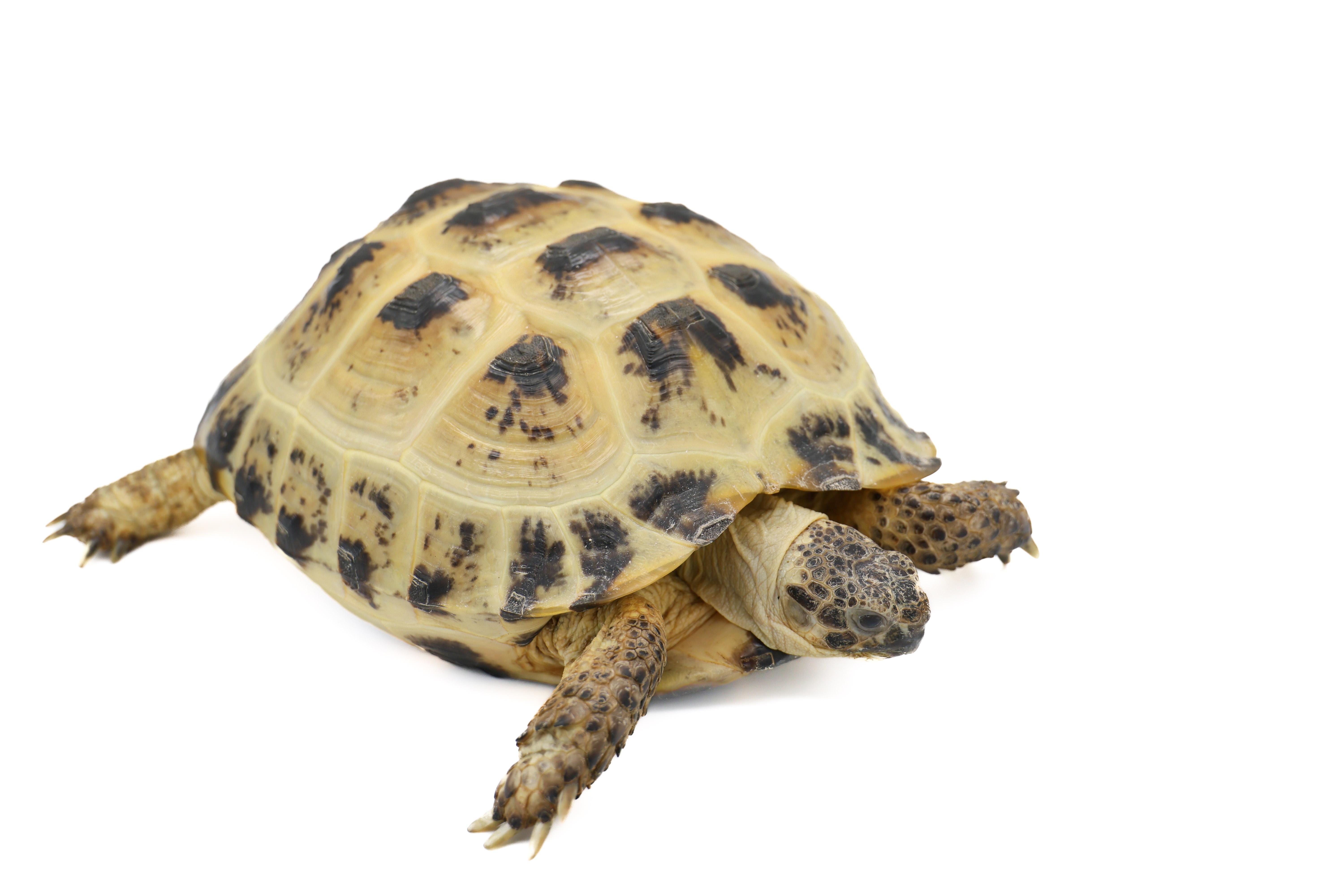 ロシアリクガメの写真素材です。黄褐色の甲羅に黒い放射状の模様が入り、ゴツゴツとした前脚と太い後脚で地面に着いた横向きの姿勢を白背景で撮影しました。丈夫で温厚な性質のロシアリクガメはペット紹介や爬虫類関連のコンテンツ、動物図鑑制作におすすめです。