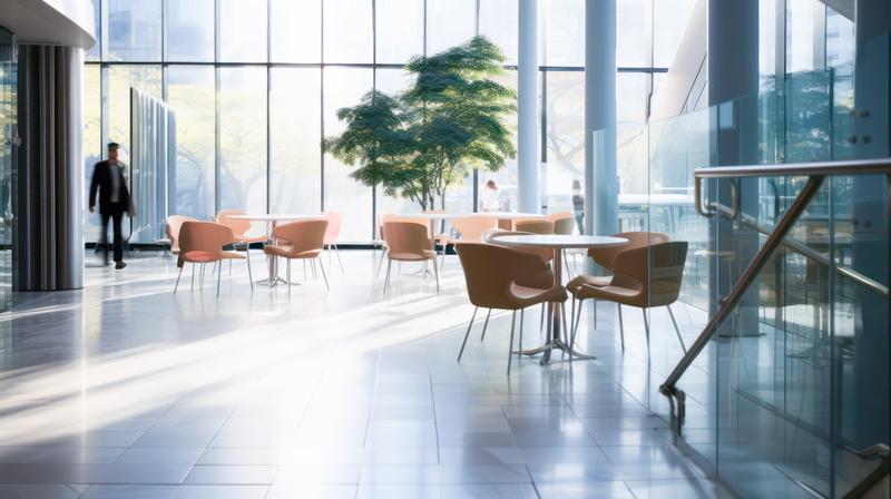 自然光が差し込む高層ビルのロビーとオフィス空間のAI画像素材(フリー)